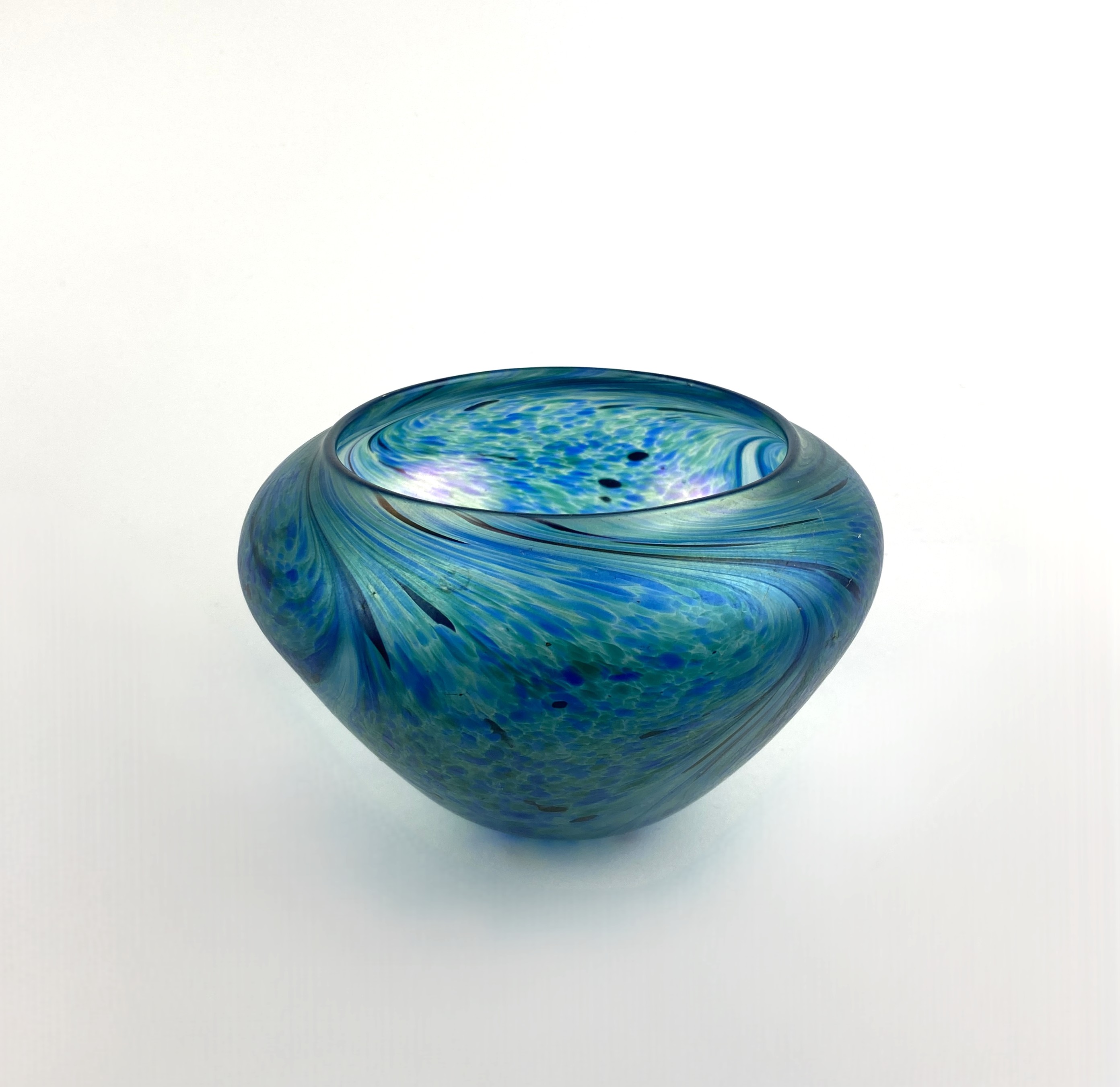 An irredescent turquoise art glass vase, in the manner of Monart/ Midsummer Glassmakers, with pontil mark to base, height 11cm