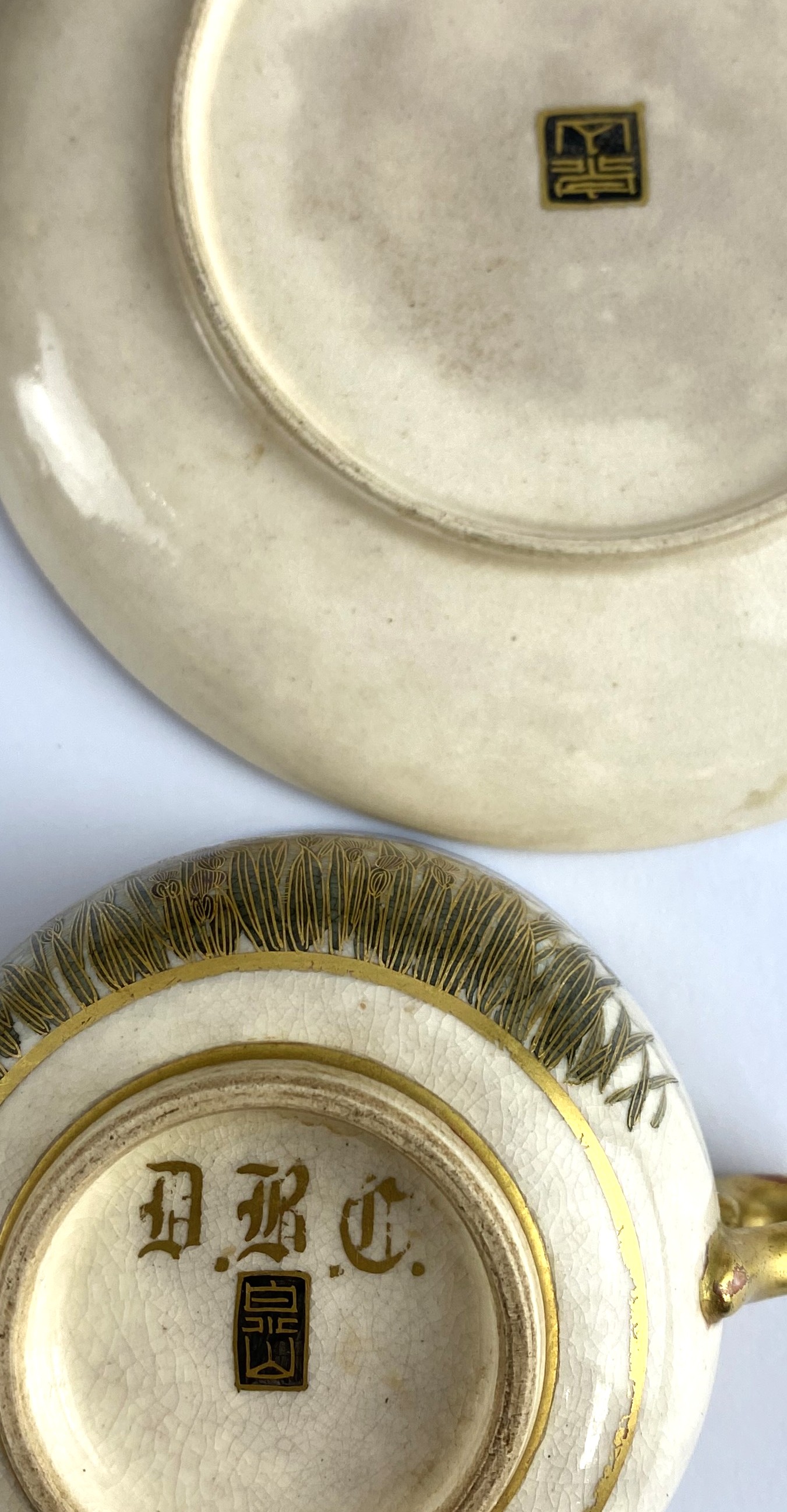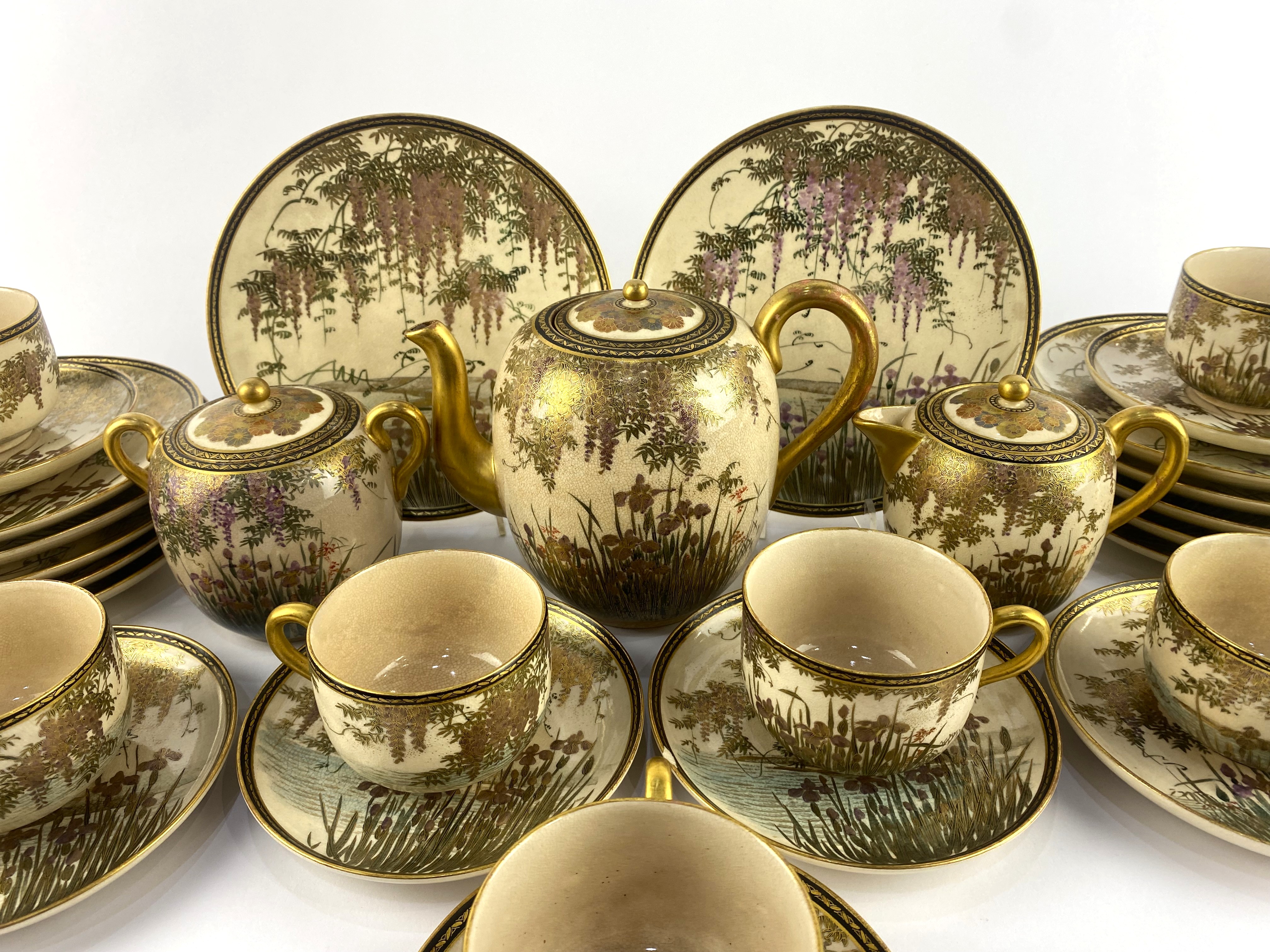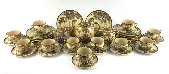 A Japanese Satsuma part tea service, Meiji period, decorated with iris and wisteria pattern, gilt heightened, including; teapot, covered two handled sugar bowl, covered milk jug, eleven tea cups, eleven saucers, twelve side plates, each bearing character mark to base and variously initialled (38 pieces)