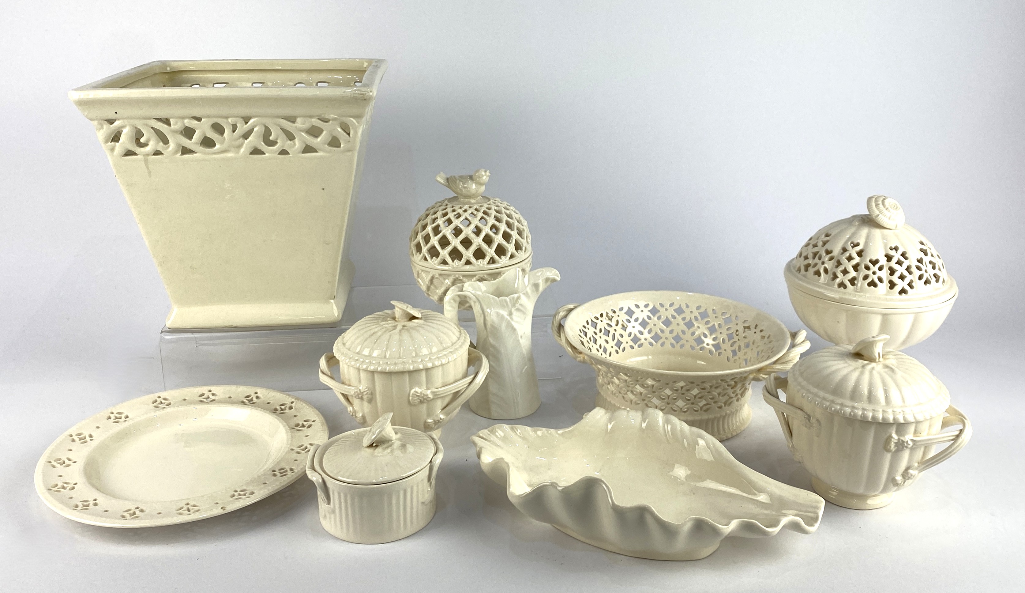 A collection of creamware to include a pair of Leedsware 'Classical Creamware' two handled pots and covers and a shell shaped dish, together with a Royal Worcester leaf cream jug