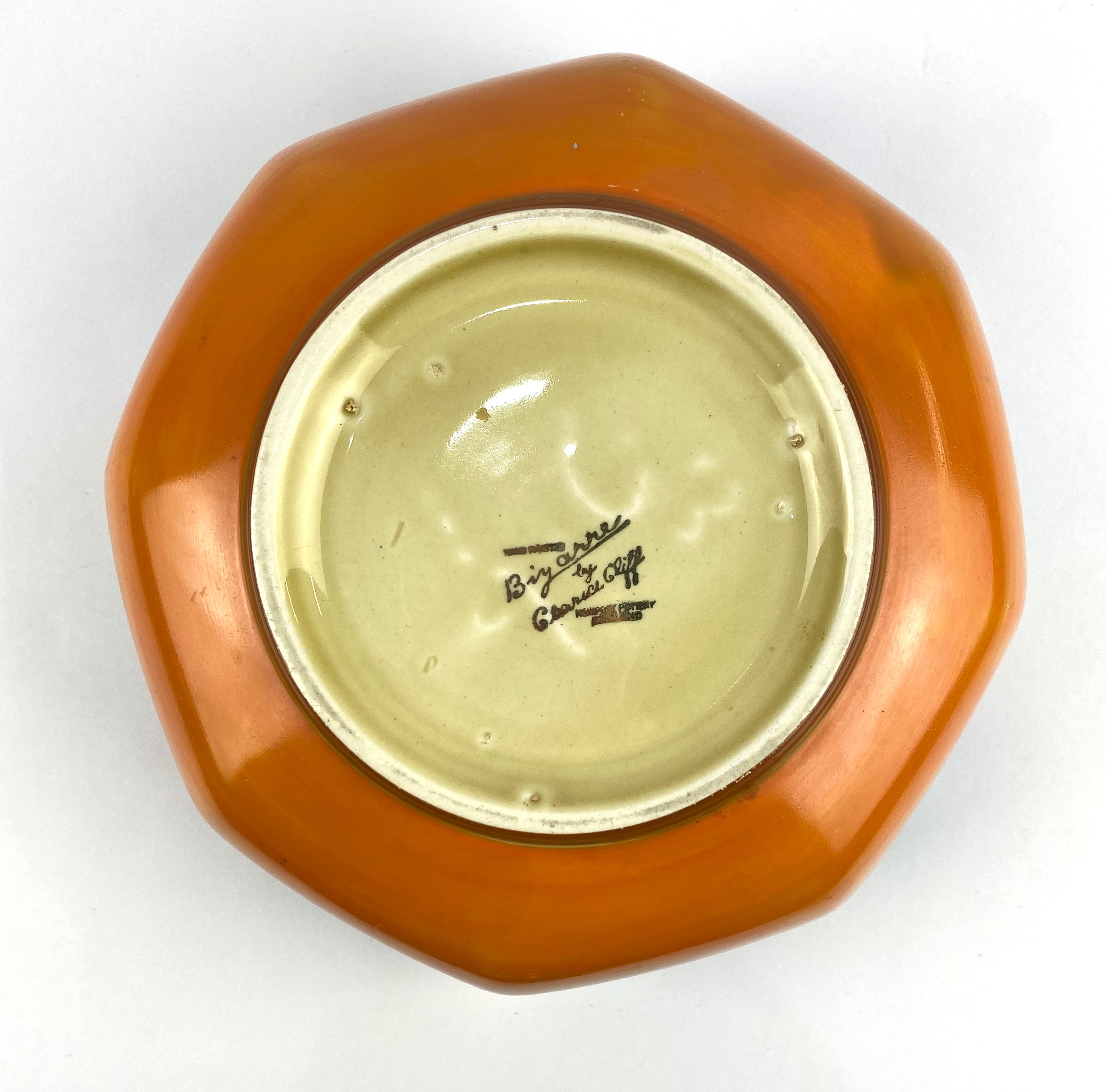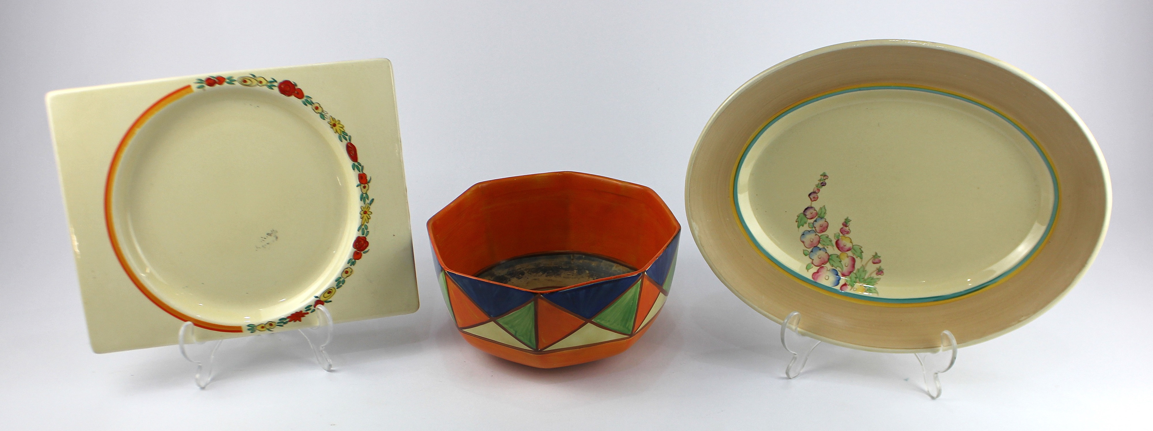 A Bizarre by Clarice Cliff fruit bowl with geometric border in blue, green and orange, 20.5cm diameter, together with two Clarice Cliff serving plates, including; a Bizarre by Clarice Cliff 'The Biarritz' rectangular plate, Reg. No. 784849, with decorative border of orange and yellow flowers, width 26.5cm, together with an oval serving plate, decorated with a floral spray, width 31.5cm