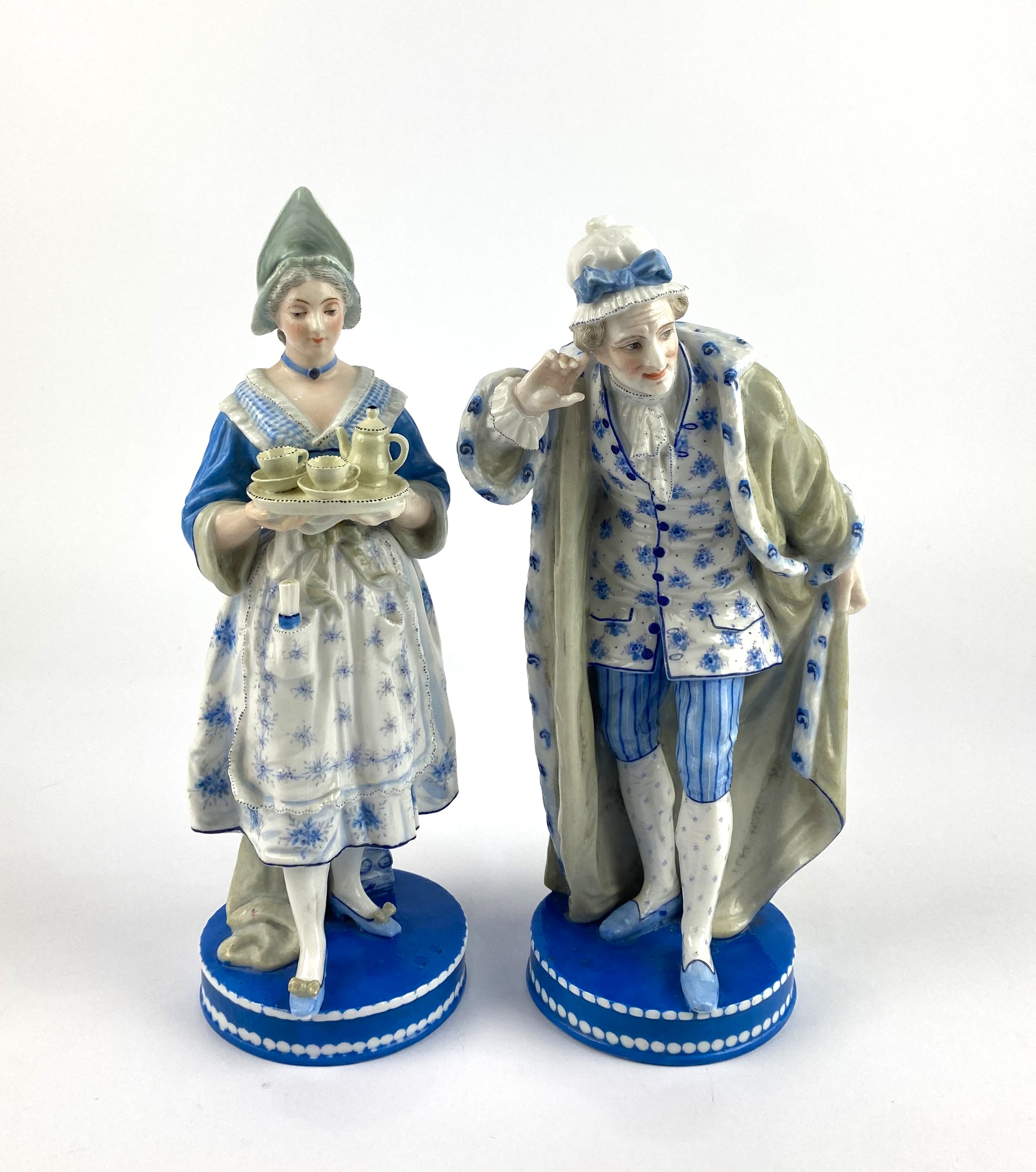 A pair of 19th century continental porcelain figures, depicting an elderly gentleman and a female attendant carrying a tray with a tea pot and two cups, underside bears faux anchor marks, 24cm high.