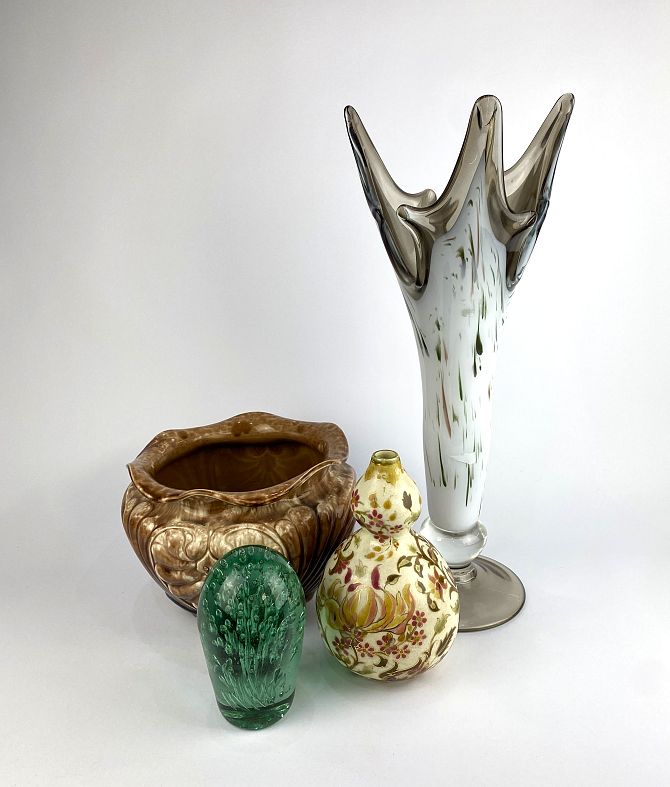 A Zsolnay Pecs double gourd shaped vase with floral decoration and gilt embellishments 21cm high, a green glass dump with bubble inclusions 15cm, an 'End of Day' glass vase 48cm, and a Matthews & Clark Ltd brown glazed jardiniere 17cm high (4)