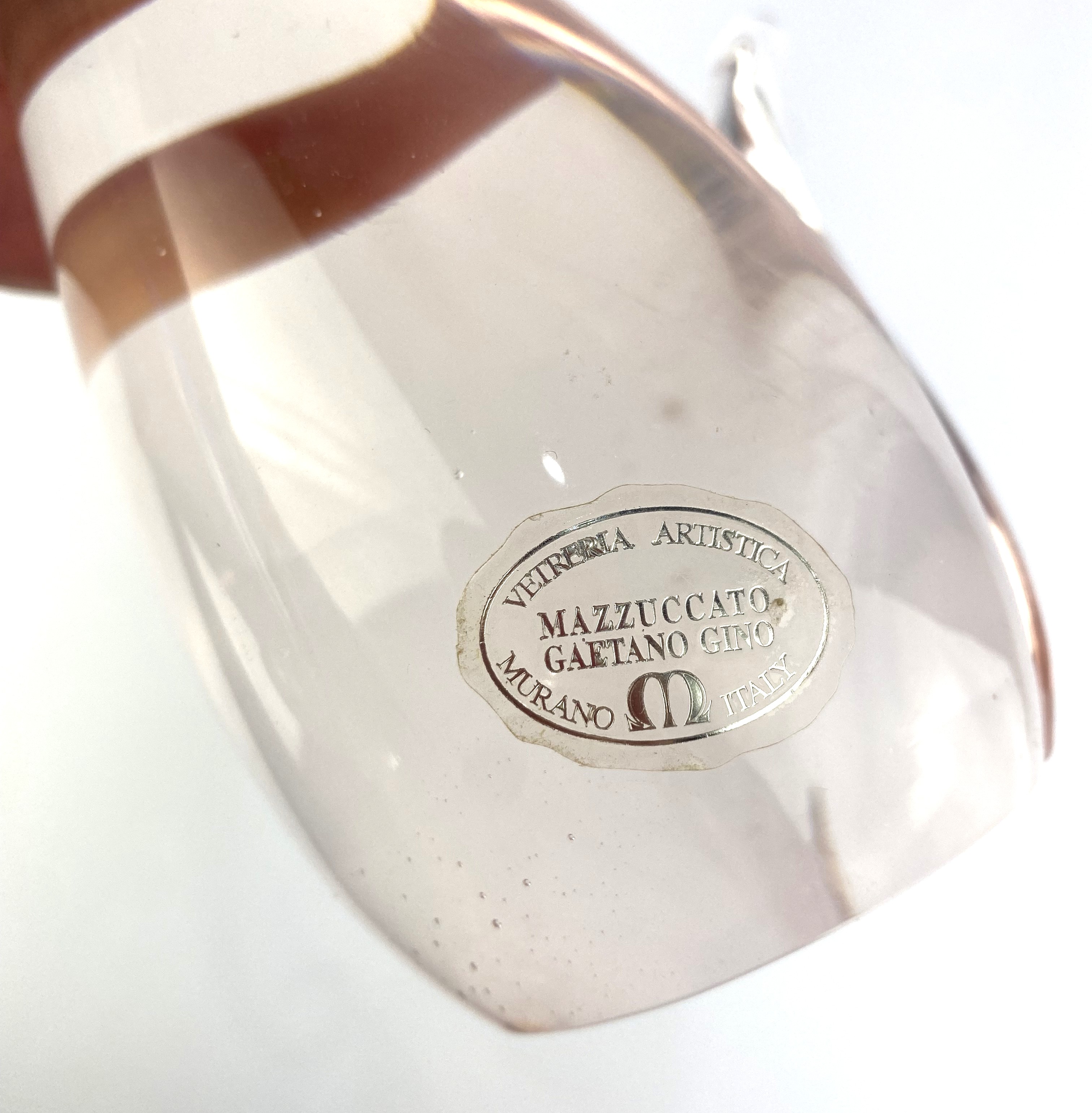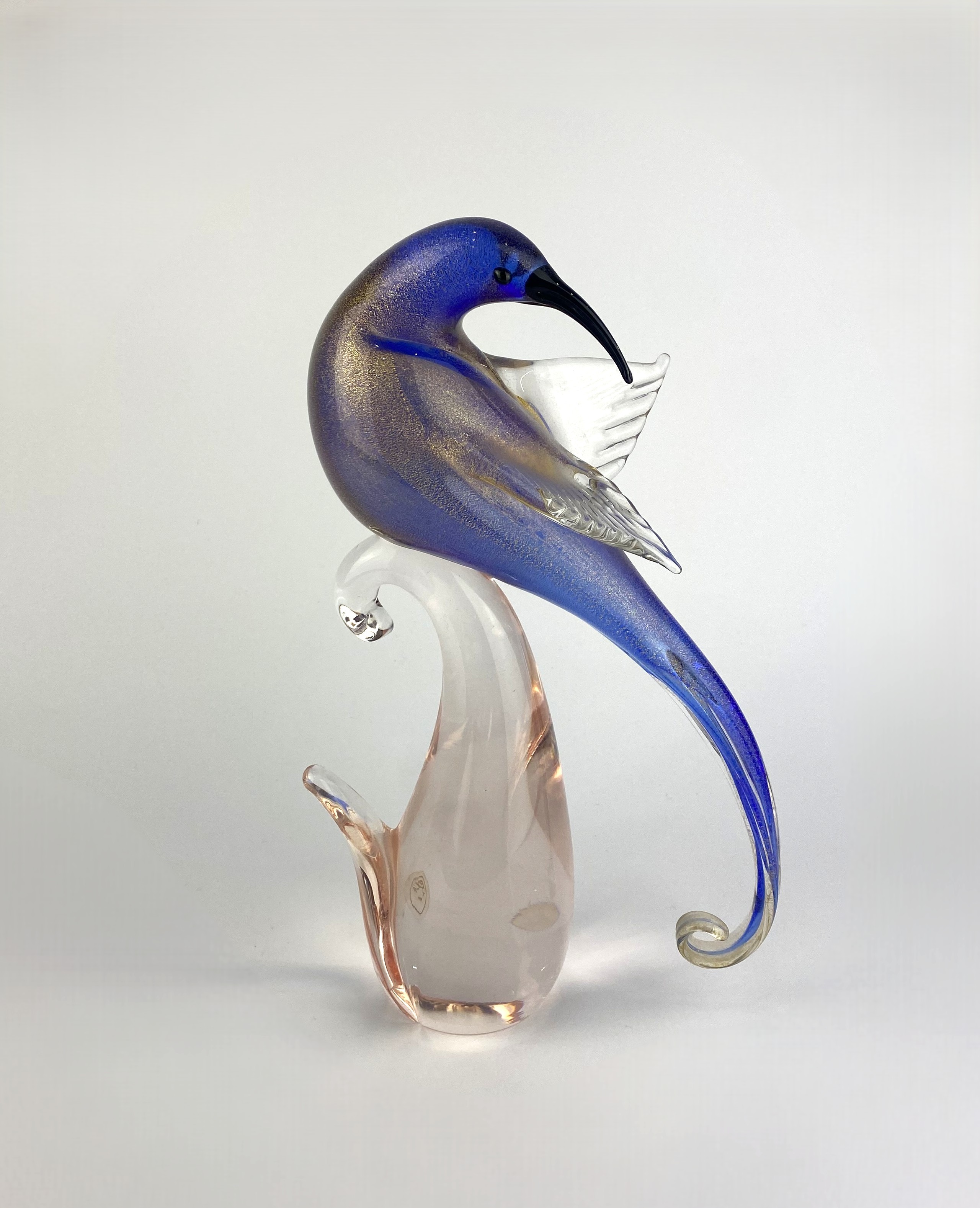 A vintage Murano art glass hummingbird, in blue gold speckled glass, upon a shaped rose glass base, bearing label 'Vetriria Artistica Mazzuccato Gaetano Gino, Murano, Italy', height 28cm