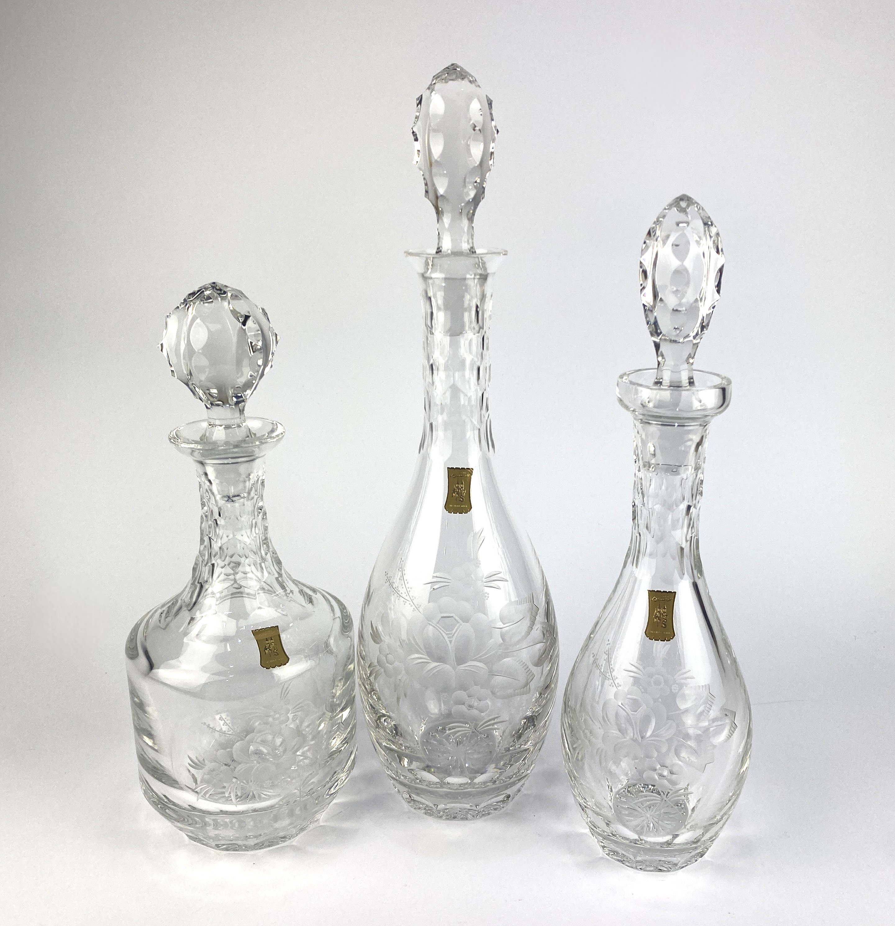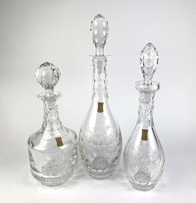 Three Meissener Bleikristall cut glass decanters, with stoppers, with factory labels, and in original boxes, (3).