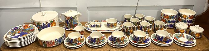 A Villeroy & Boch Acapulco pattern fifty-one piece part service comprising tureen and cover (one handle detached), large bowl, platter, six dinner plates, four lunch plates, six small plates, six bowls, condiment pot and cover, two small pots (possibly missing lids) stand, teapot, five cups and six saucers, seven mugs, sugar bowl, milk jug, sugar bowl and cover