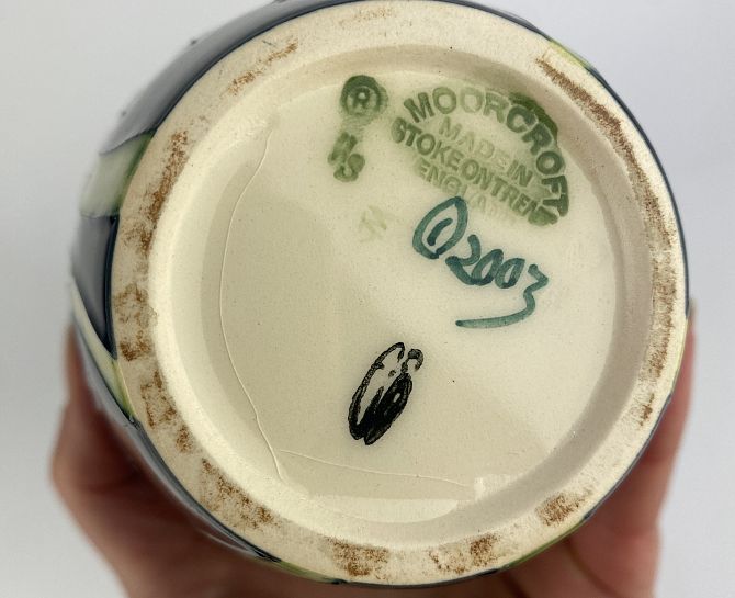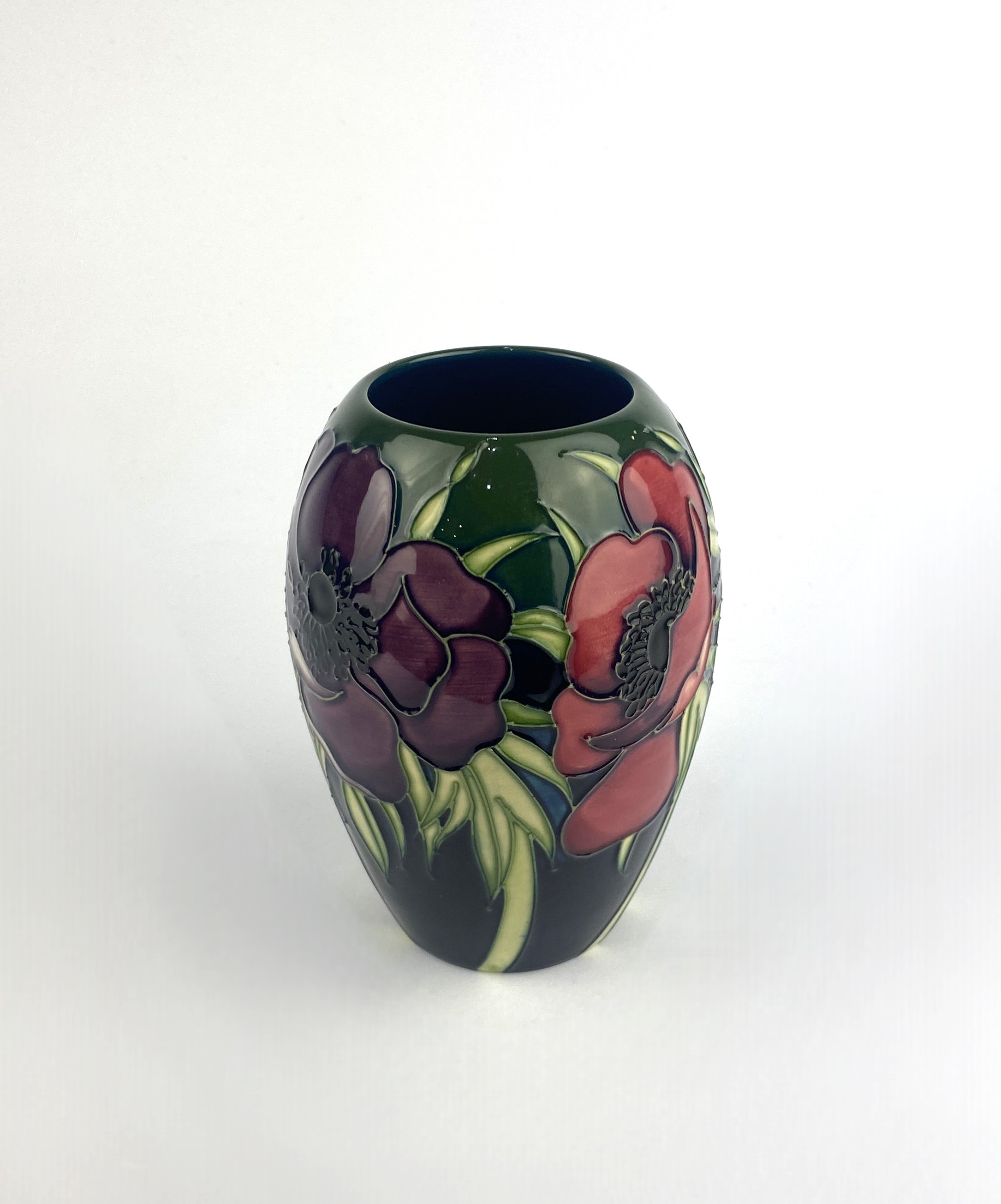 A Moorcroft Pottery 'Anemone' patterned vase, 2003, by Emma Bossons, tube line decorated against the dark green ground with anemonies, initialled and variously impressed marks to base, height 13.75cm