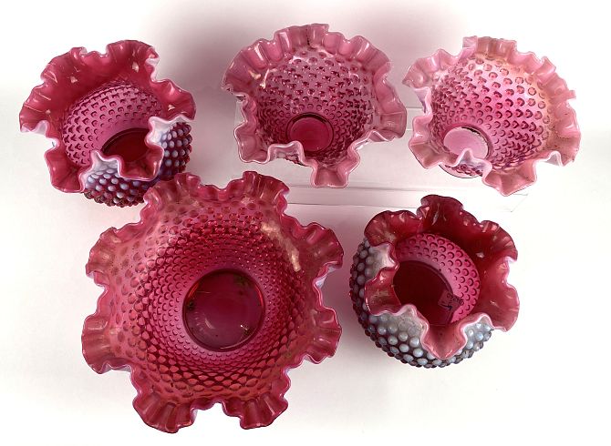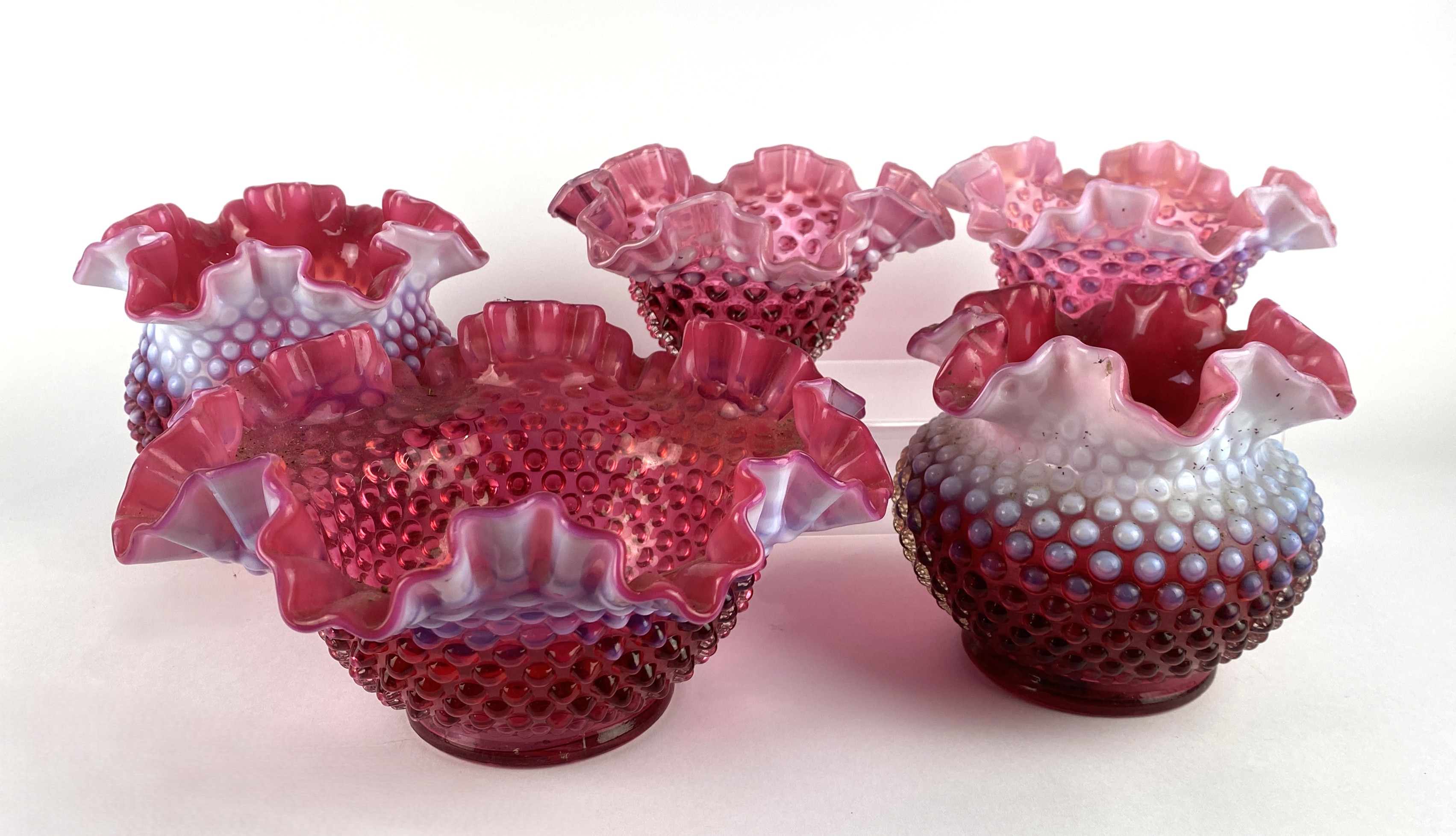 Five Victorian Fenton Cranberry glass vases, sizes from 13cm high to 10cm high, and diameters from 24cm to 15cm, (5).