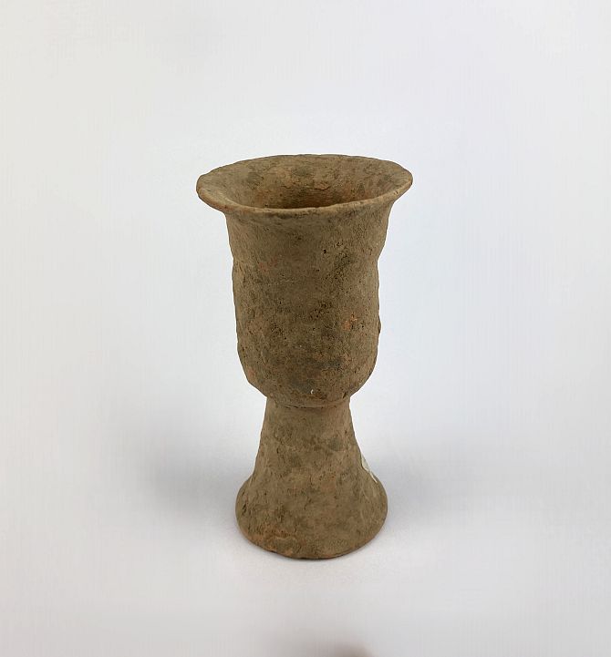 A Chinese pottery stem cup, believed to be Neolithic, c.3000BC - 2000BC, presents with signs of antiquity ageing and patination, 12cm high.