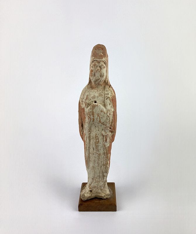 A Chinese pottery figure, believed to be Tang Dynasty (618AD - 907AD), presents with signs of ageing and patination, figure 21cm high, raised on a later wooden plinth, (af).