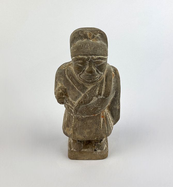 A Chinese pottery figure depicting a midget, believed to be Tang Dynasty (618AD - 907AD), presents with signs of ageing and patination, 13cm high, (af).