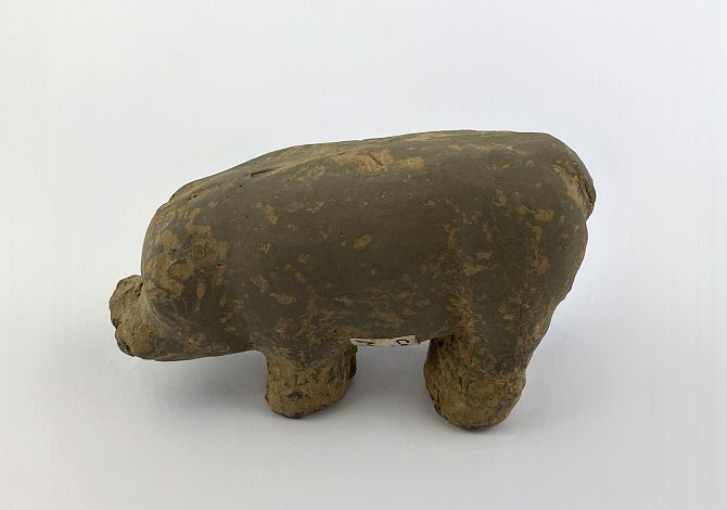 A Chinese pottery model of a standing boar, believed to date to c.100 - 200AD, bears label to underside 'COLLECTION OF M. O'HARA', shows signs of antiquity wear and patination, 14cm long by 9cm high.