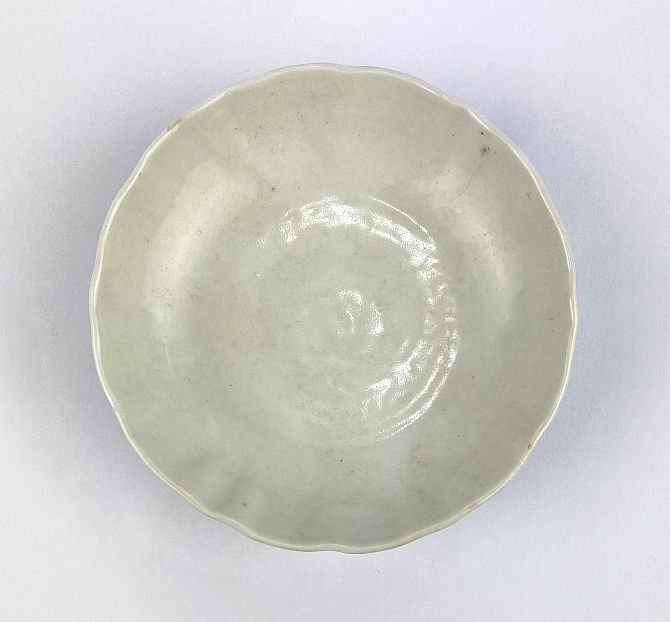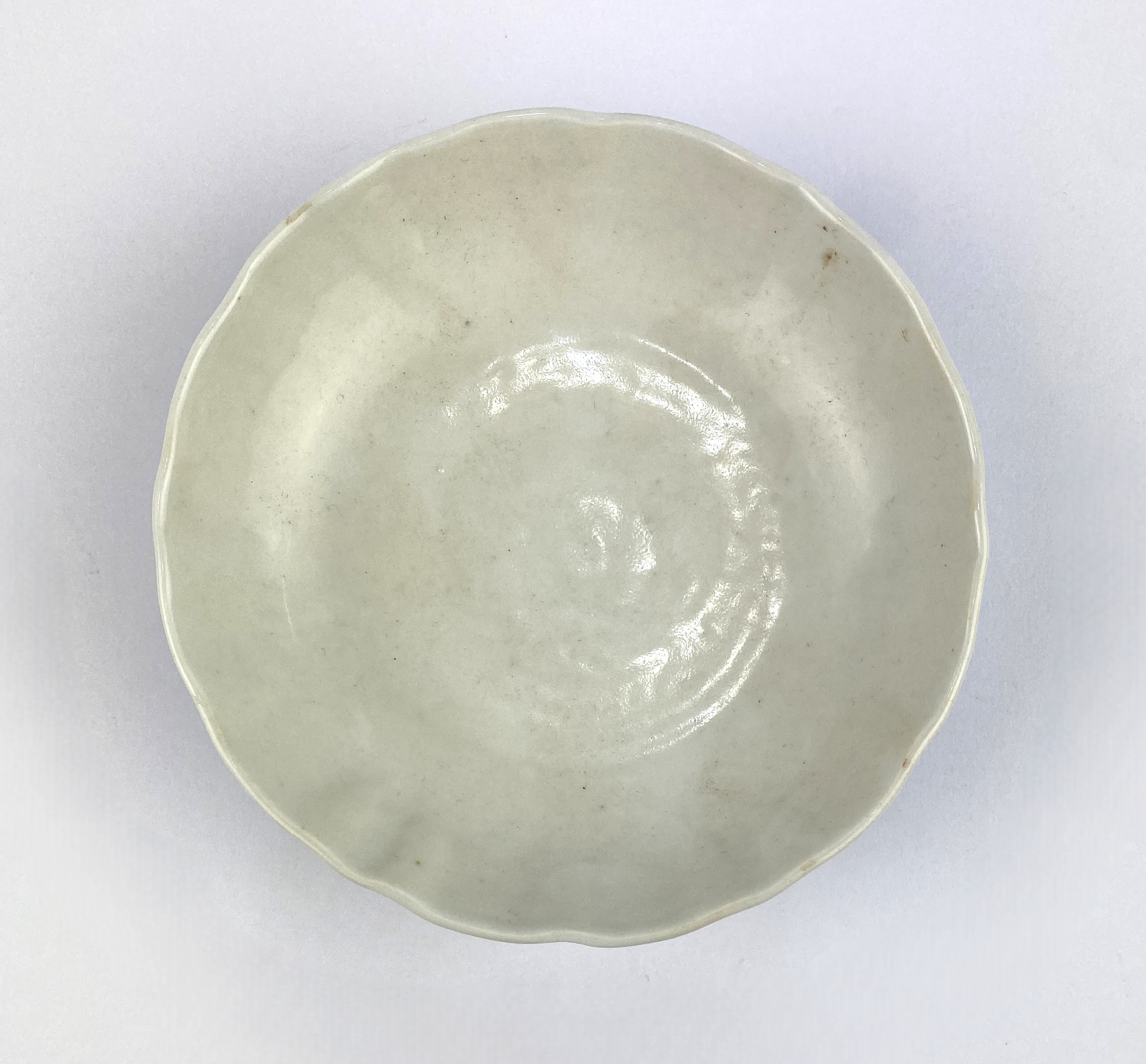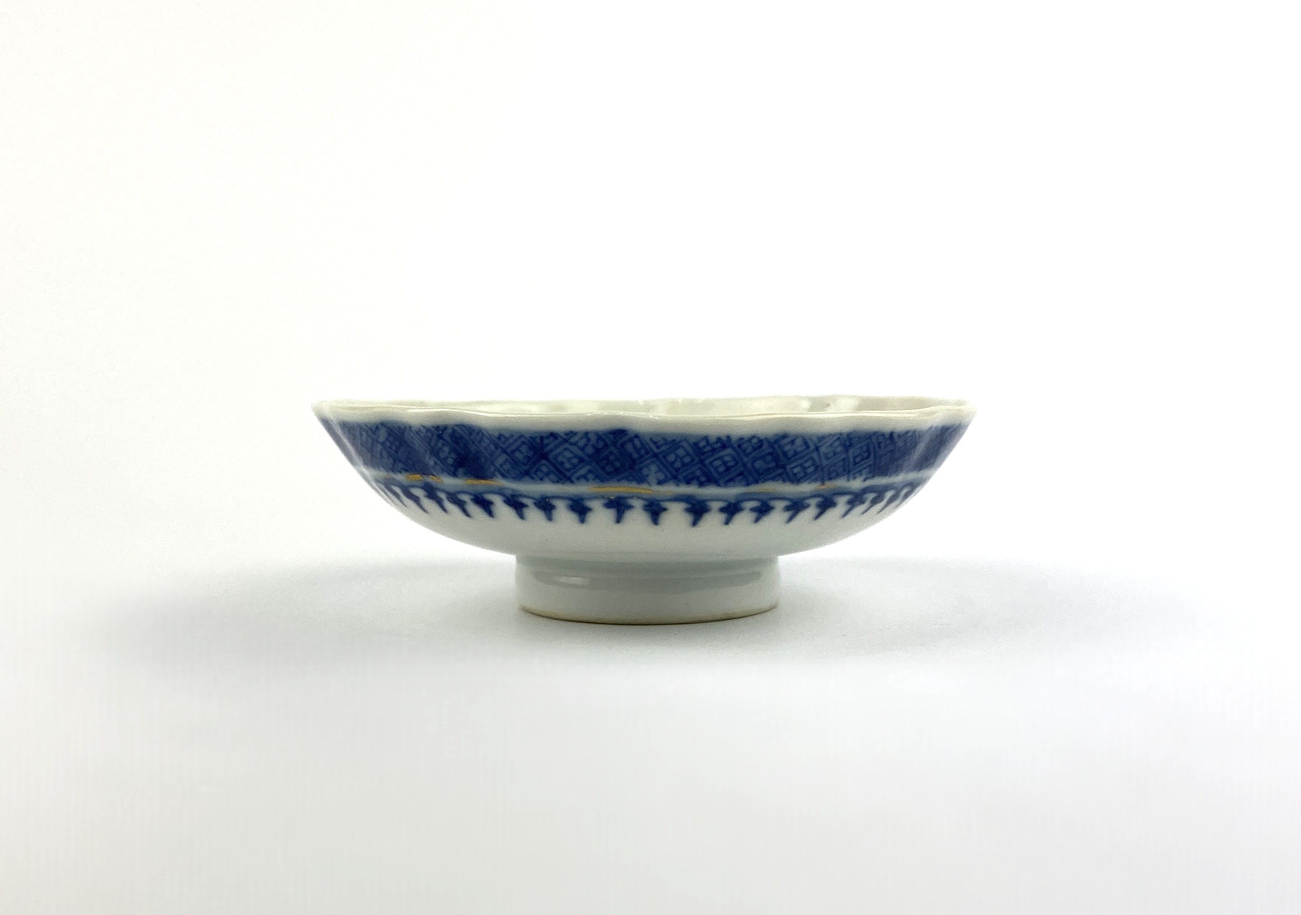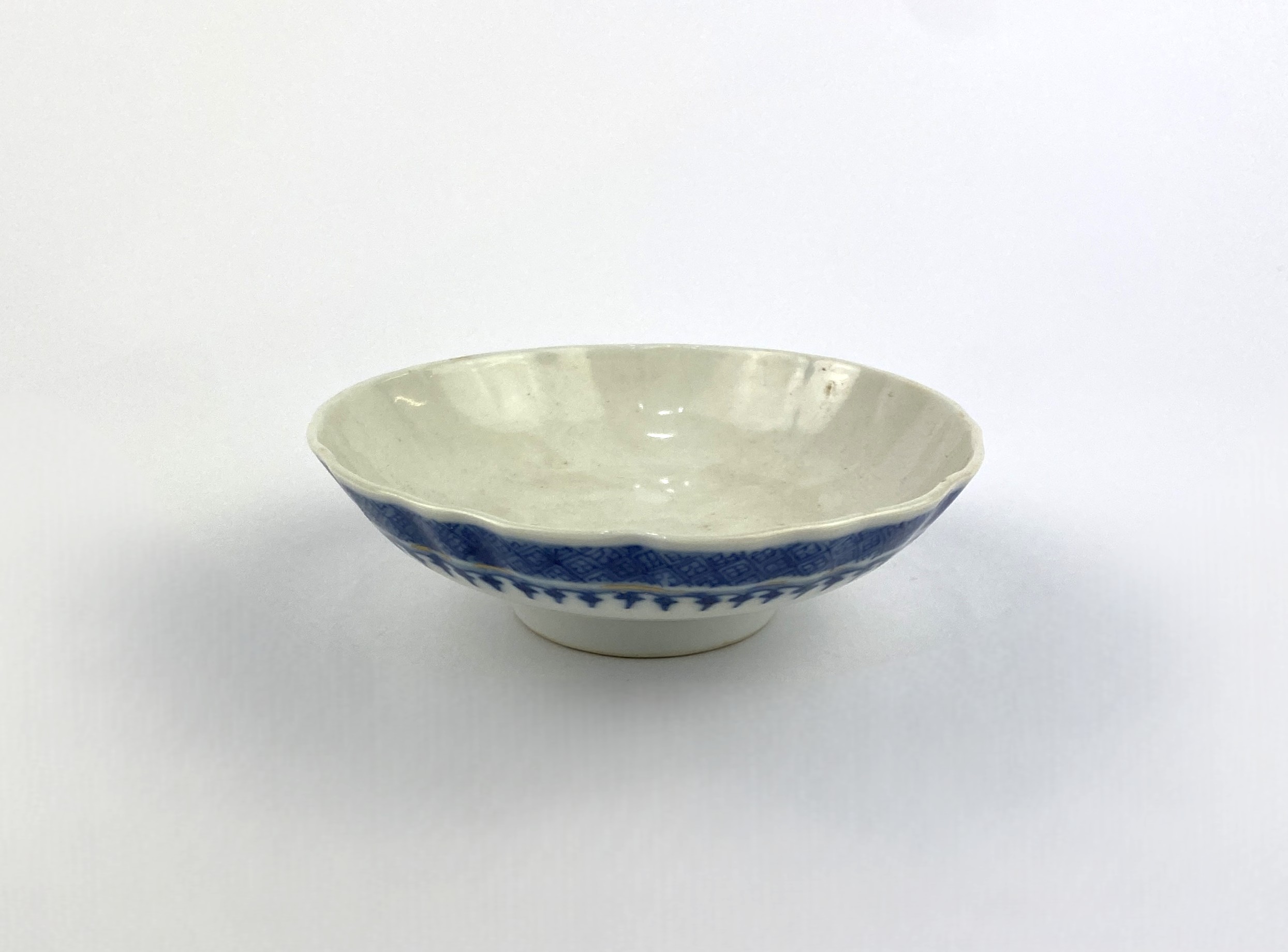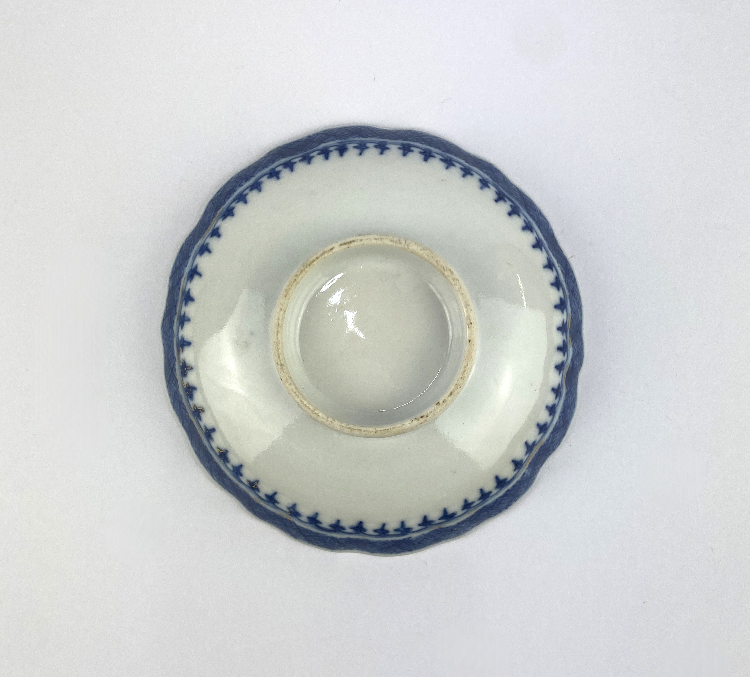 A Chinese blue and white porcelain dish, believed to be c.1790, the shallow flared circular form painted to the underside rim with a band of stylised motifs, and traces of gilt, raised on a short foot, 11cm diameter by 3.5cm high.