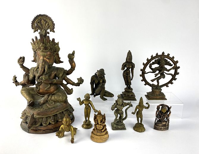 A cast metal figure of a seated Ganesha, cast with mushak to feet, height 32.5cm, together with a small resin figure of ganesha, a small cast metal figure of the infant Krishna carrying a ball, height 8cm, a resin figure of shiva, a cast metal figure of a dancing shiva, height 15.5cm, an Indian cast metal figure of the Parvati, height 10cm and a cast bronze figure, possibly of Rhada, height 10cm, and with three further Indian cast metal figures of Hindu deities (10)