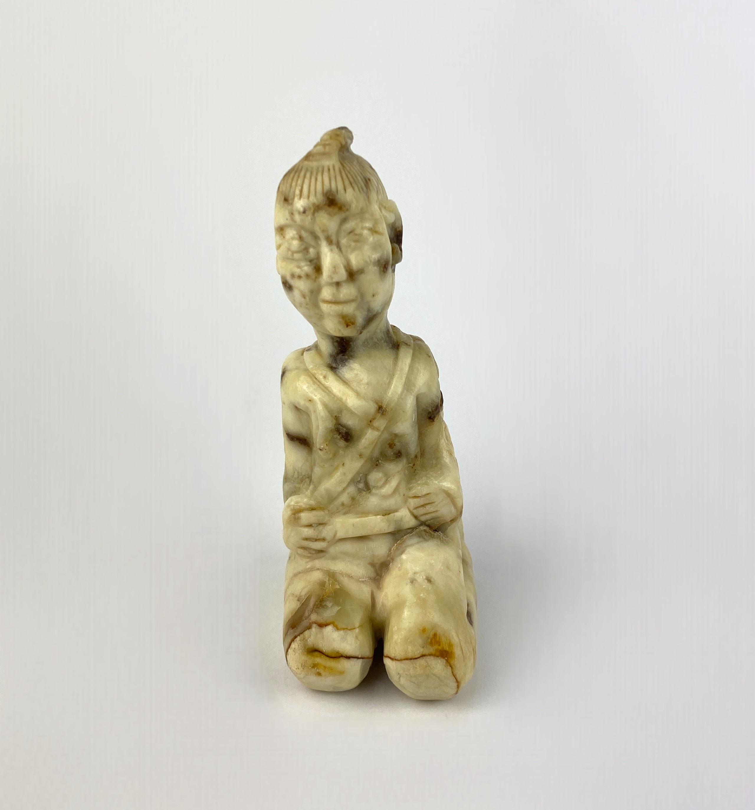 A Chinese carved jade kneeling figure, believed to be Tang Dynasty (618AD - 906AD), presenting signs of age, wear and patination, 13cm high.