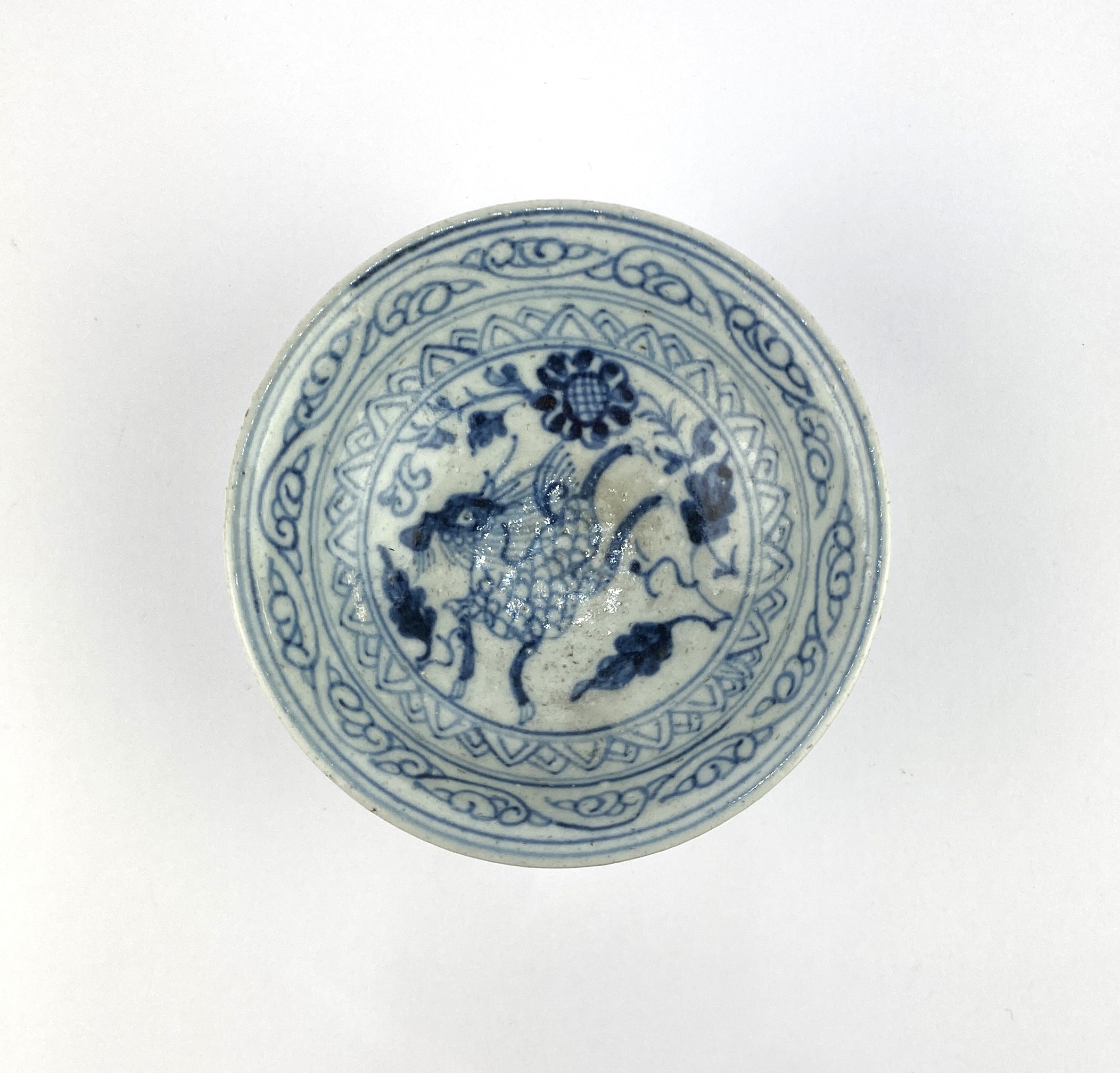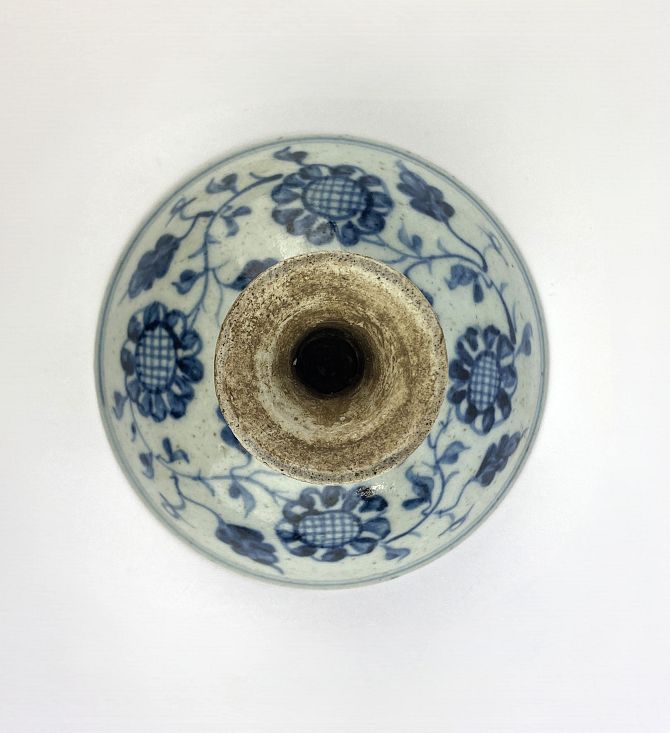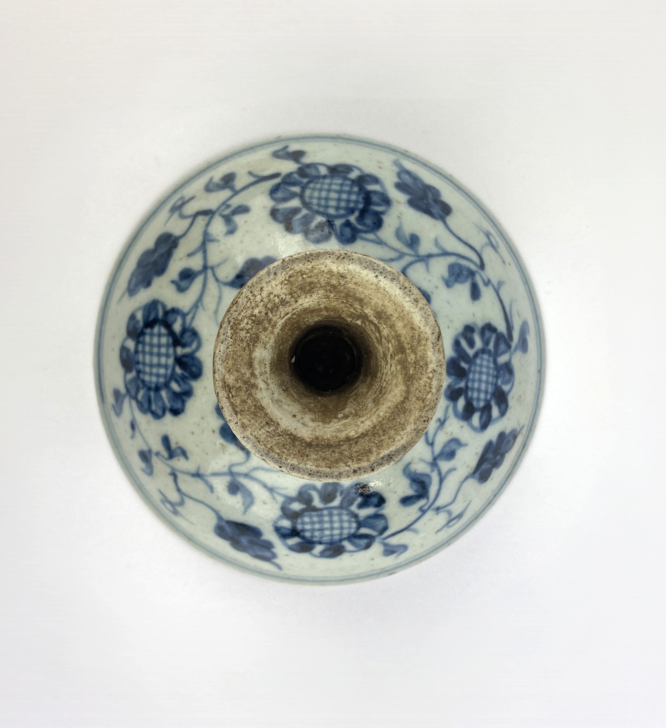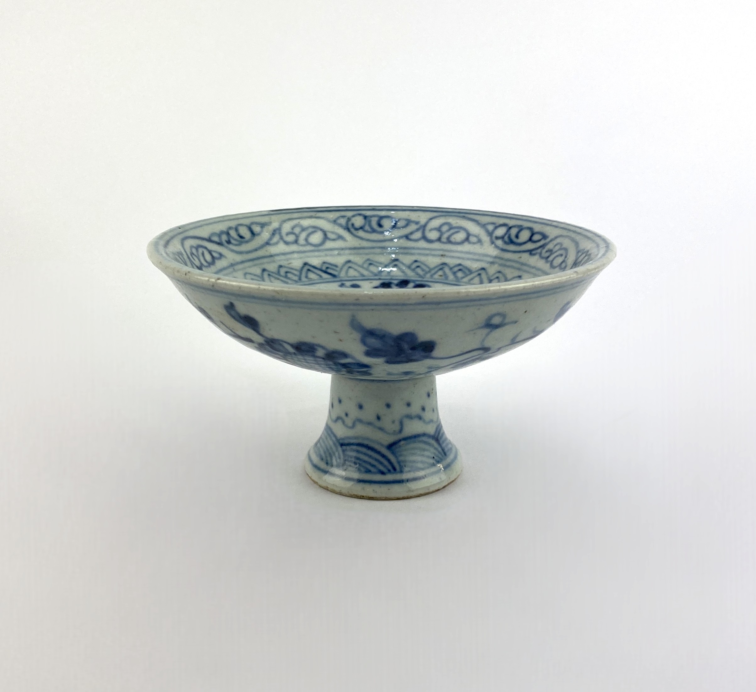 A Chinese blue and white porcelain stem bowl, believed to be Ming Dynasty (1368 - 1644), the thickly potted bowl painted to the inside with a mythical creature amidst bands of stylised motifs, and to the outside with meandering foliage, the flared foot painted with waves, 13cm diameter by 7cm high.