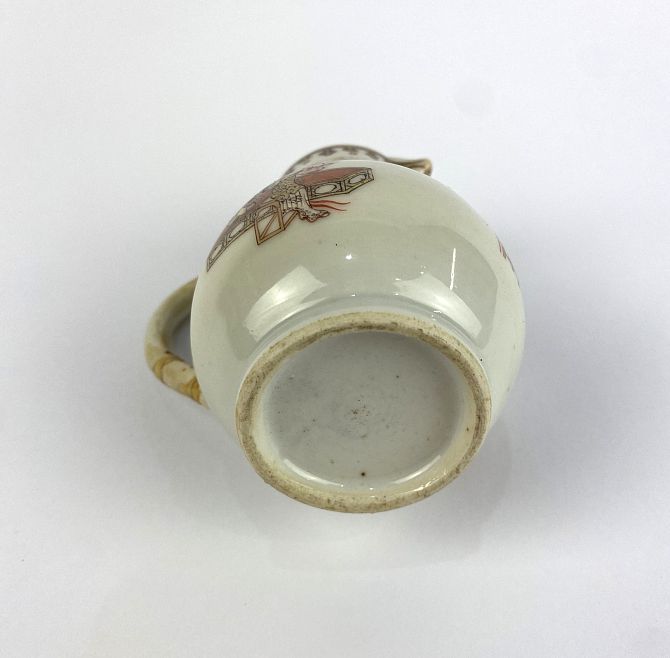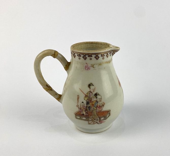 An 18th century Chinese porcelain jug, c.1760, painted in coloured enamels and gilt with figures and objects, 9.5cm high, (af).