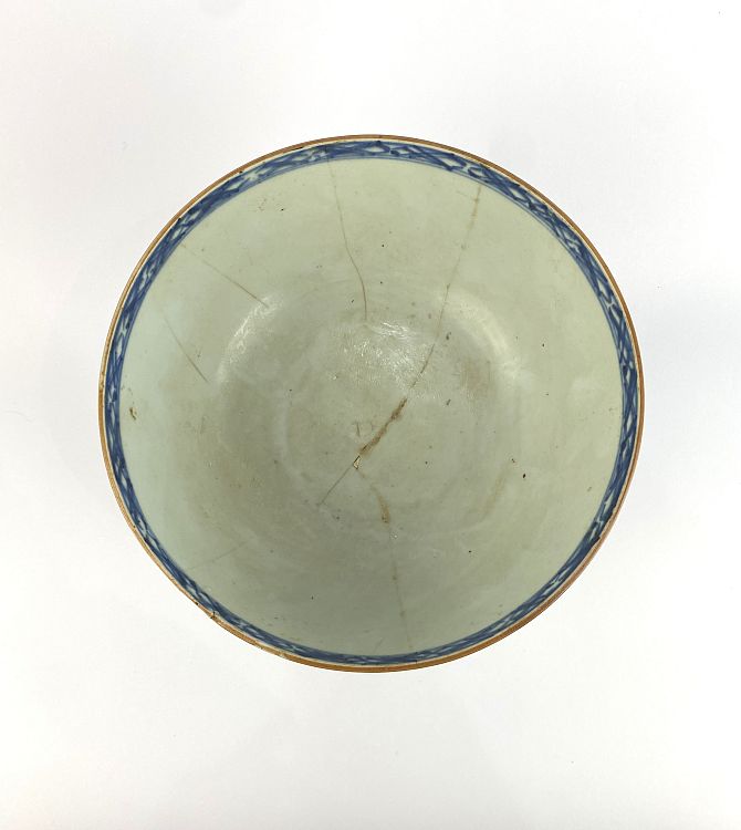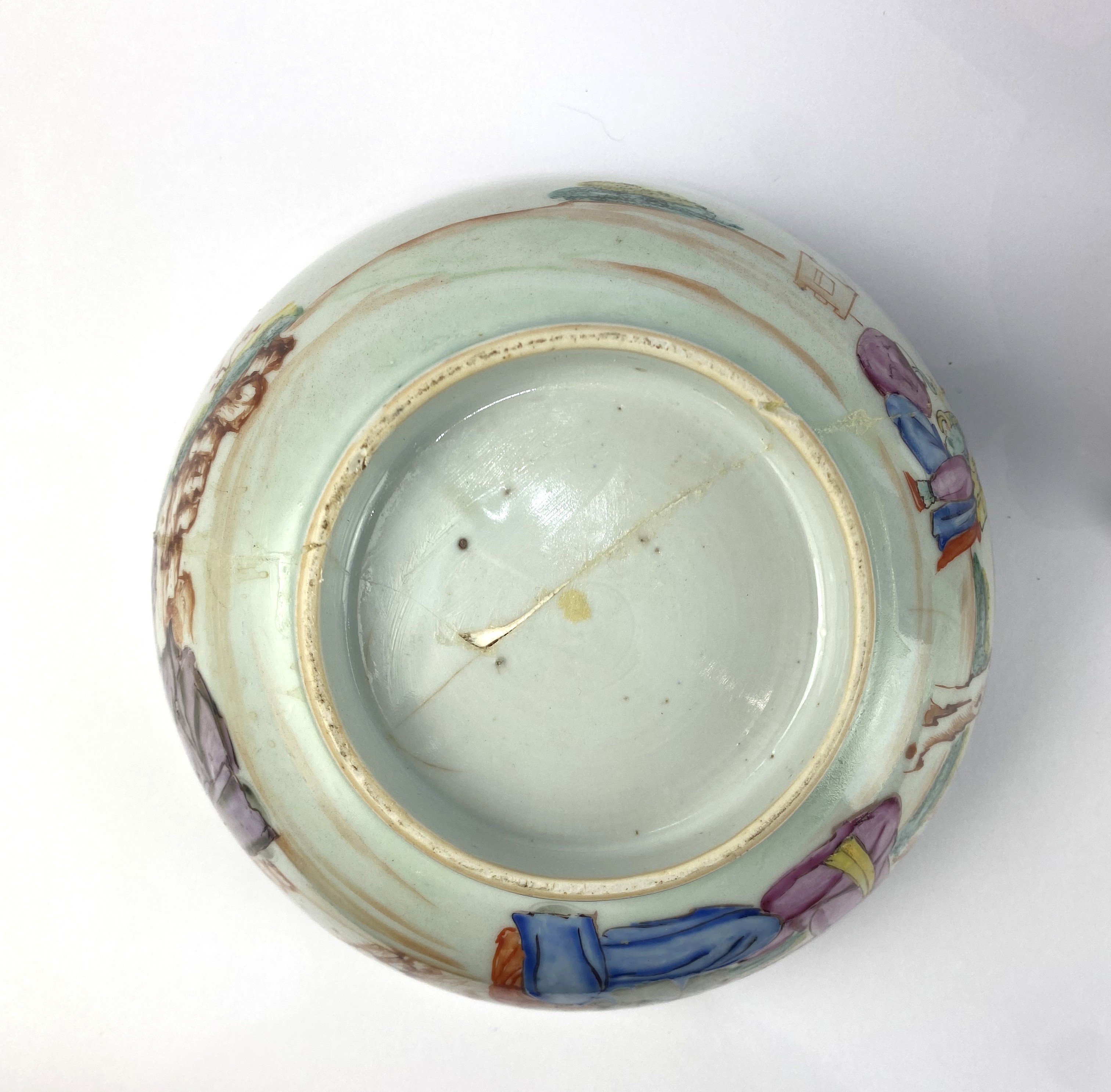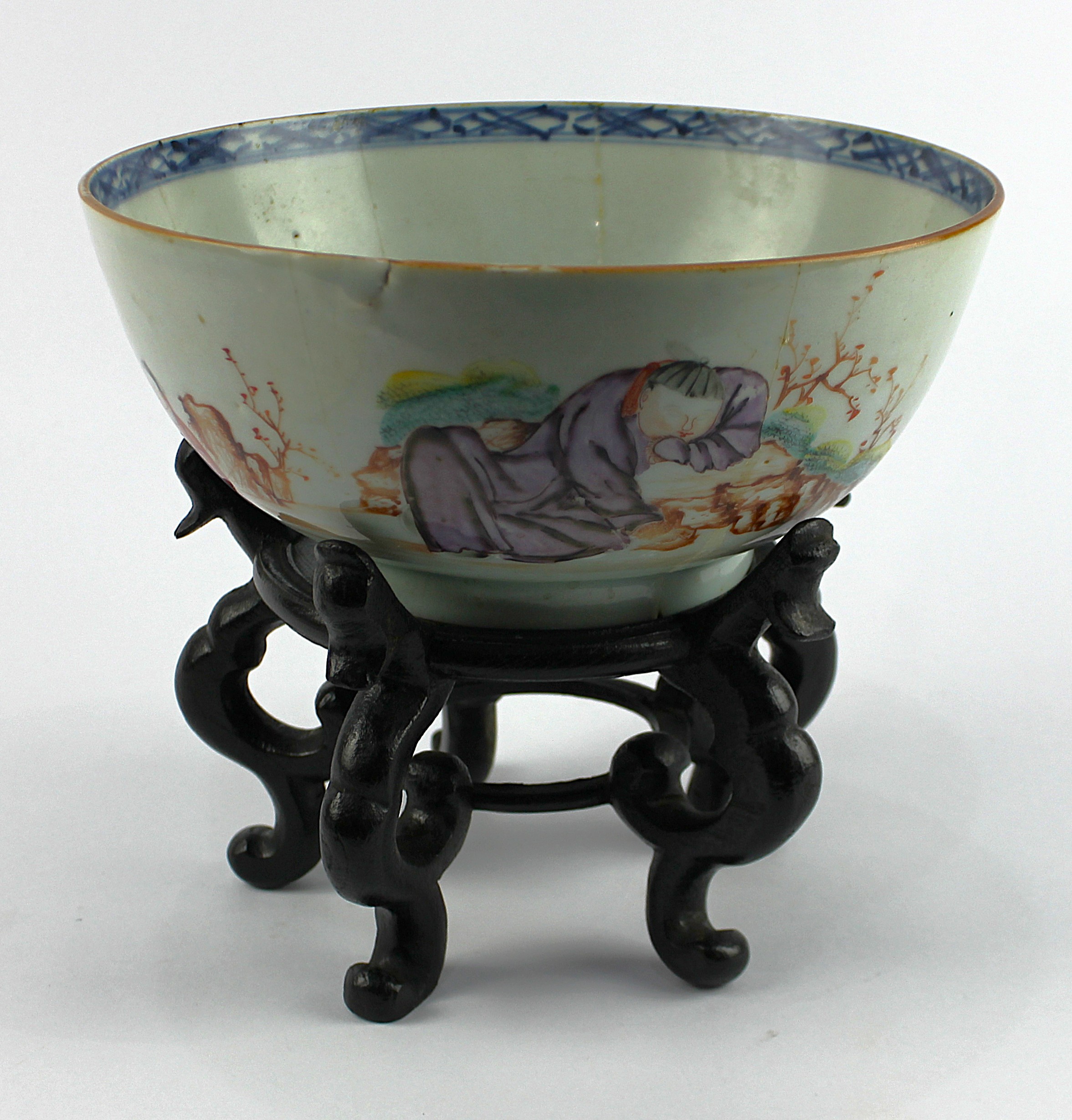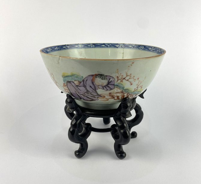 An 18th century Chinese porcelain 'Mandarin' bowl, c.1770, 20cm diameter by 9cm high, (af), with later wooden stand.
