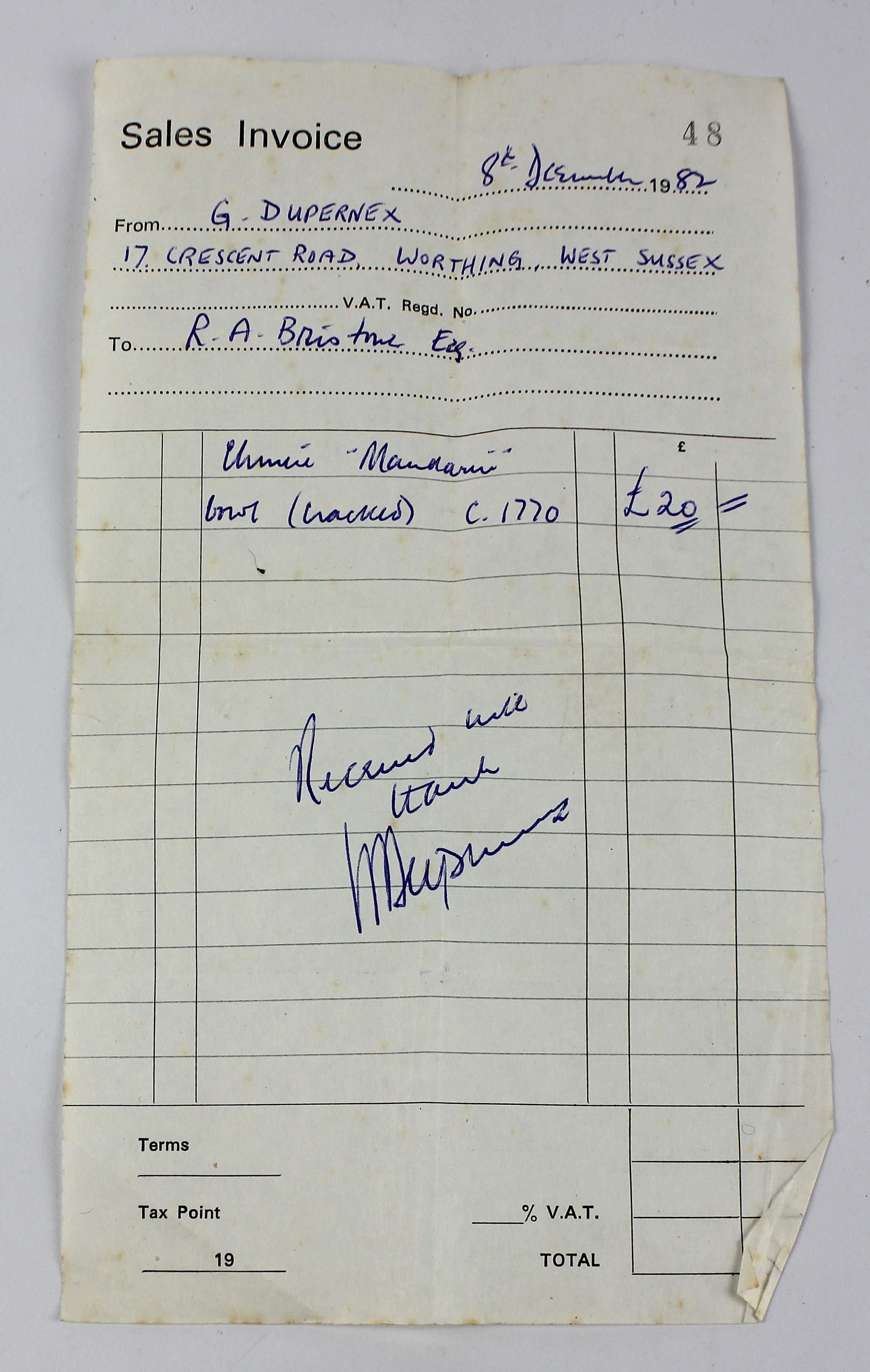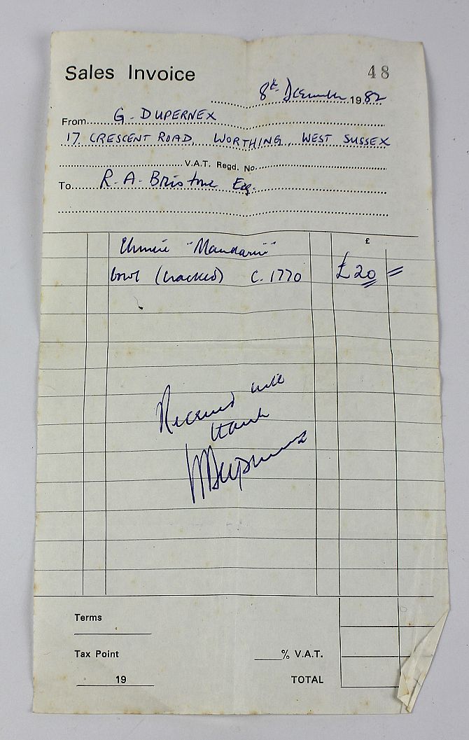 Provenance: G Dupernex, 17 Crescent Road, Worthing, West Sussex, 8th December 1982, then to a private collection.