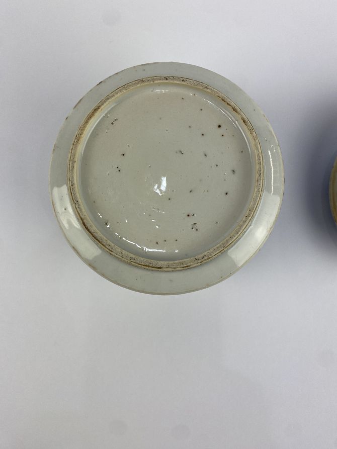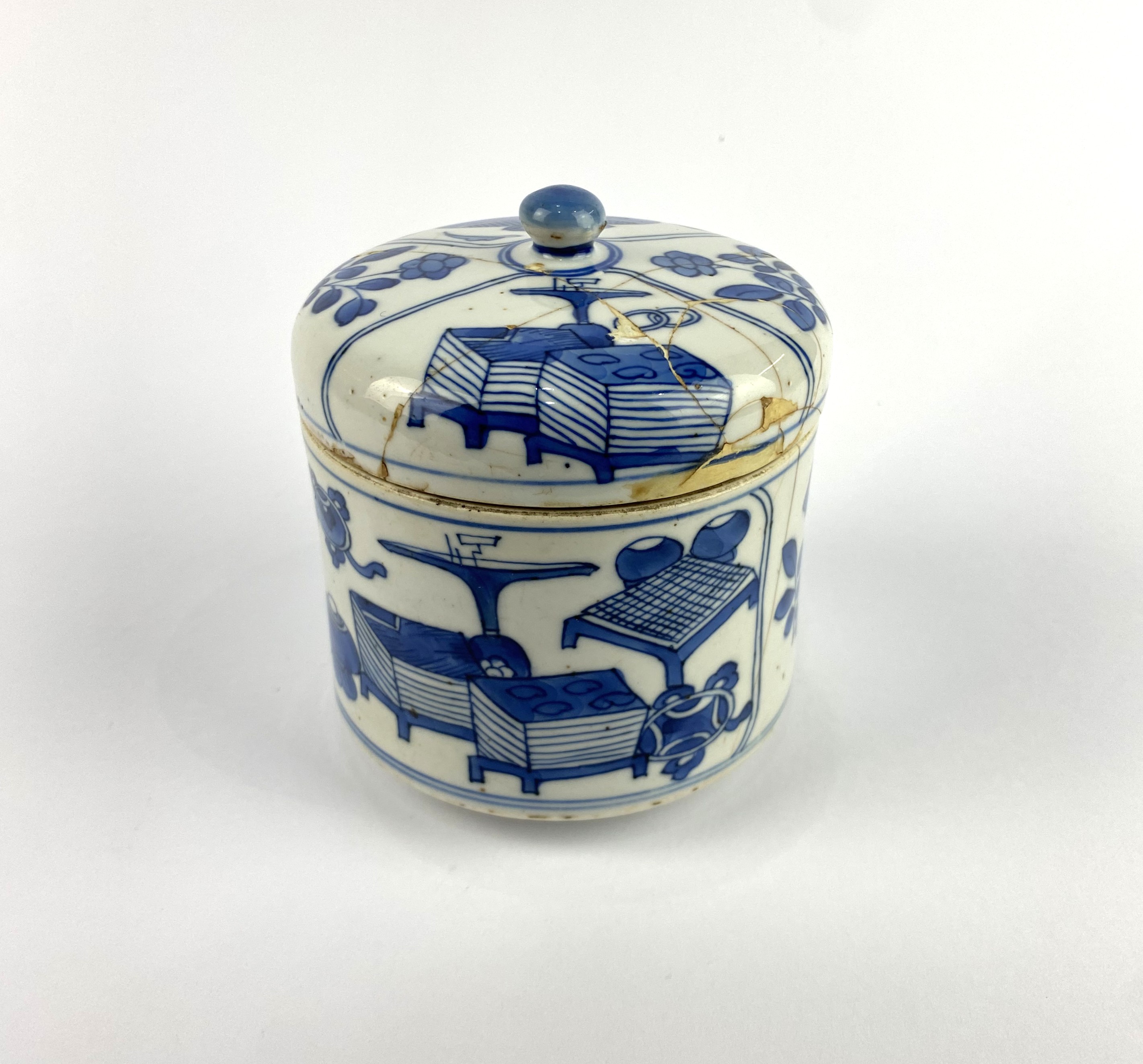 A Chinese blue and white porcelain jar and cover, c.1740, 12.5cm high by 10.5cm diameter, (af).