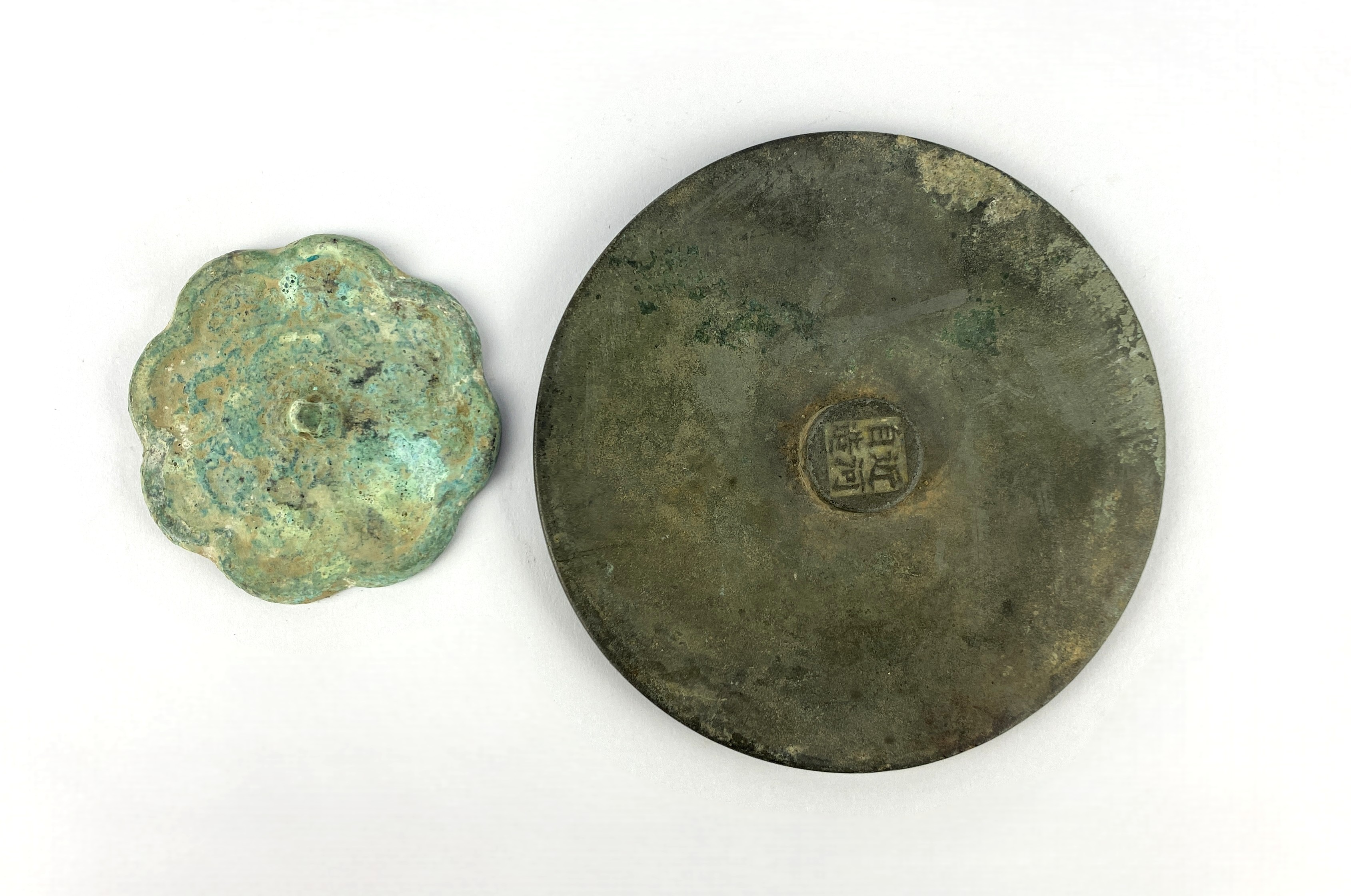 A Chinese bronze mirror, believed to be c.1480, bearing a character mark to the knop, also with an 18th century label attached with probable connection to John Stuart, 3rd Earl of Bute (1713 - 1792), 10cm diameter. Together with another smaller antique Chinese bronze mirror, 6cm diameter, (2).