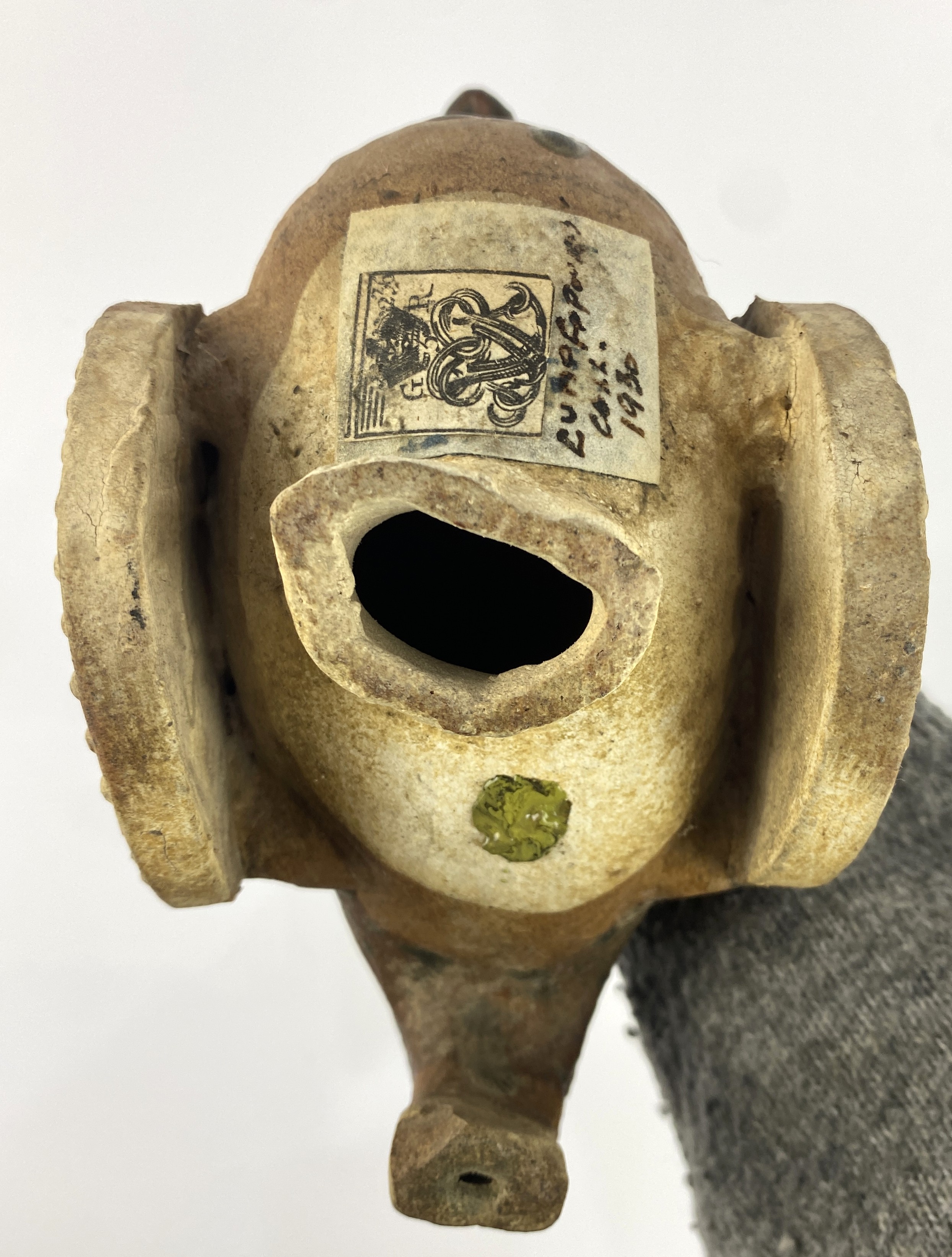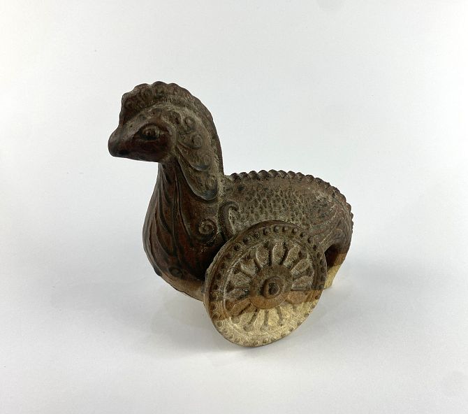 A Chinese pottery toy, modelled as a hen on wheels, age unknown, bears an old paper label to the underside with a hand written date '1930', 17cm high.