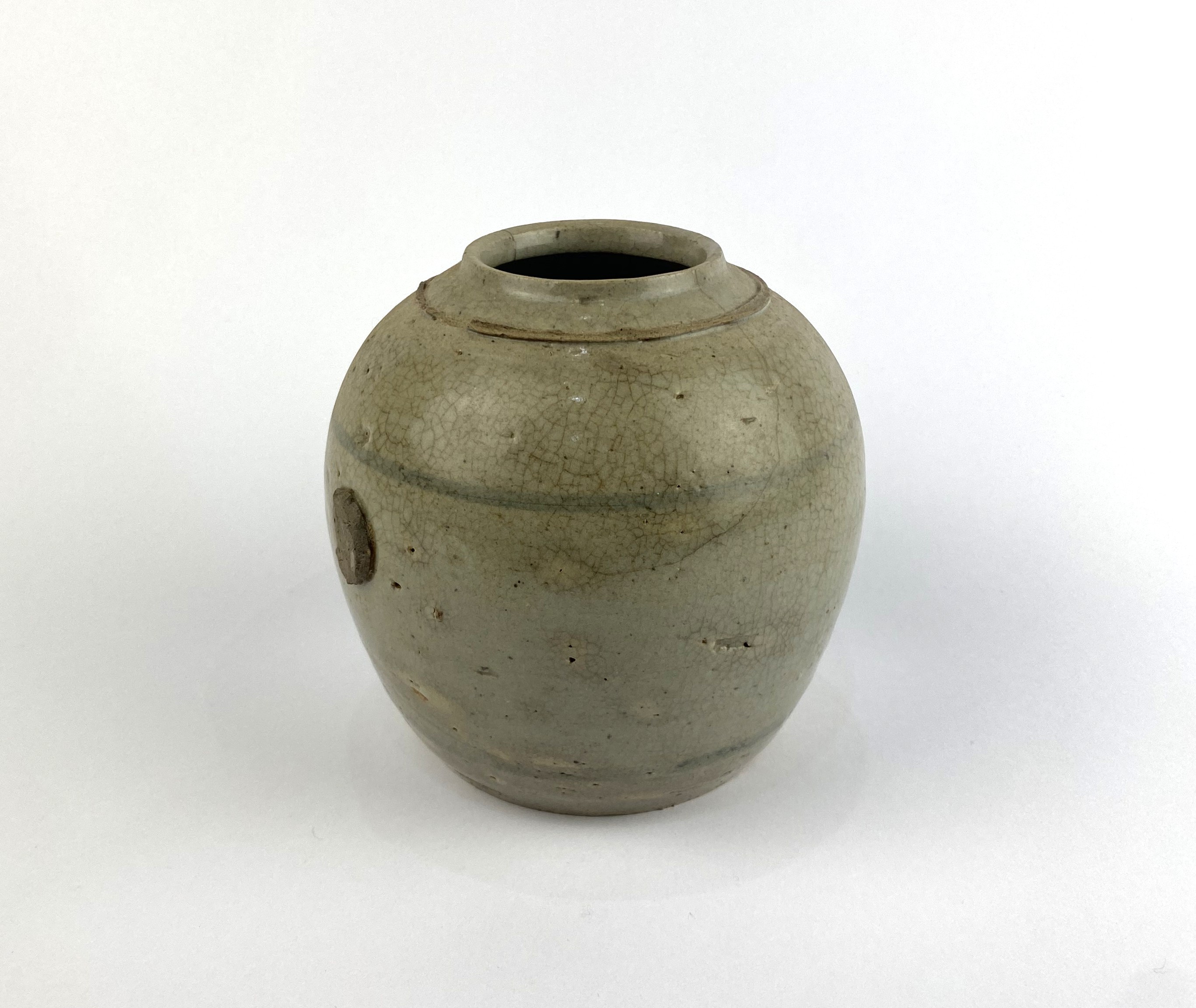 A Chinese celadon glazed ceramic ginger jar, Qing Dynasty, 13cm high, (af).