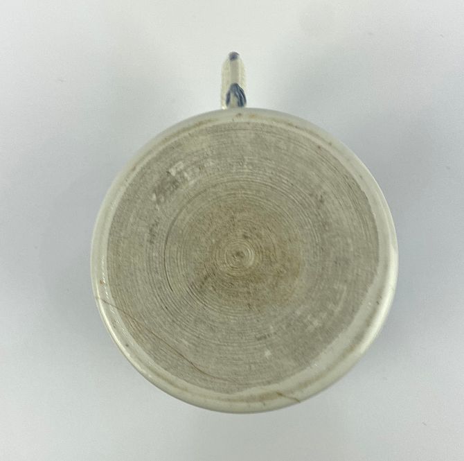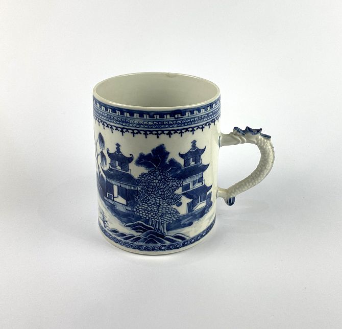 An 18th century Chinese blue and white porcelain tankard, c.1780, with dragon handle, 13cm high, (af)