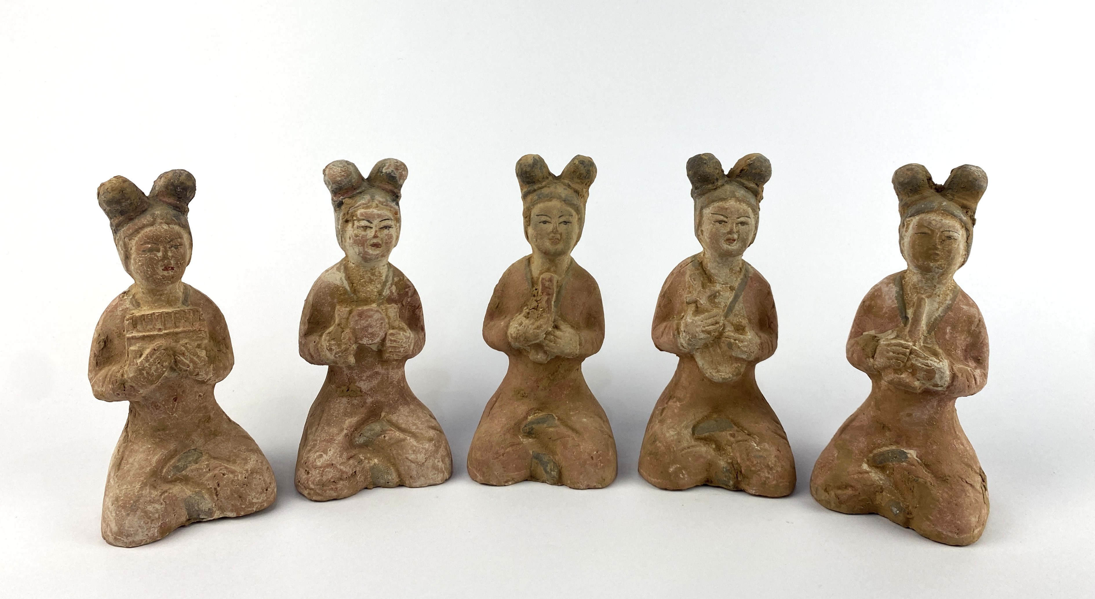 A set of five Chinese pottery ladies band figures, believed to be Han or Tang Dynasty, each figure depicted kneeling holding an instrument, approximately 15cm high, (5).