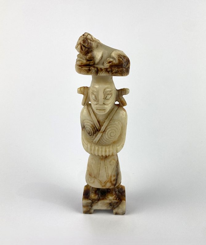 A Chinese carved jade figure, possibly Shang or Western Zhou Dynasty, the totemic standing figure on a platform base and with recumbant creature on its head, 17.5cm high.