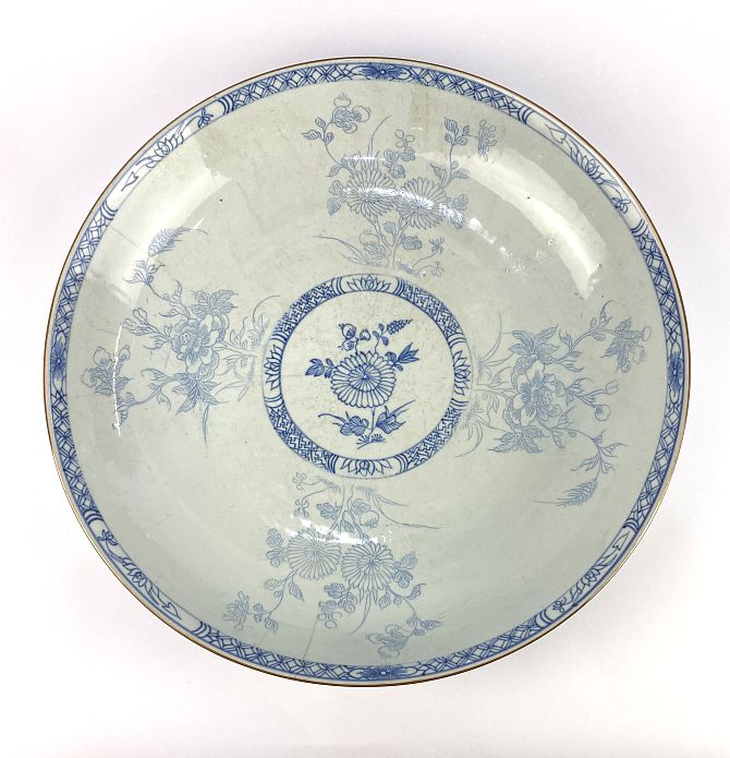 A Chinese blue and white porcelain charger, believed to be Kangxi period, c.1680, the dished circular form decorated with floral sprays, also with sparse decoration to the outside, 38cm diameter, (af).