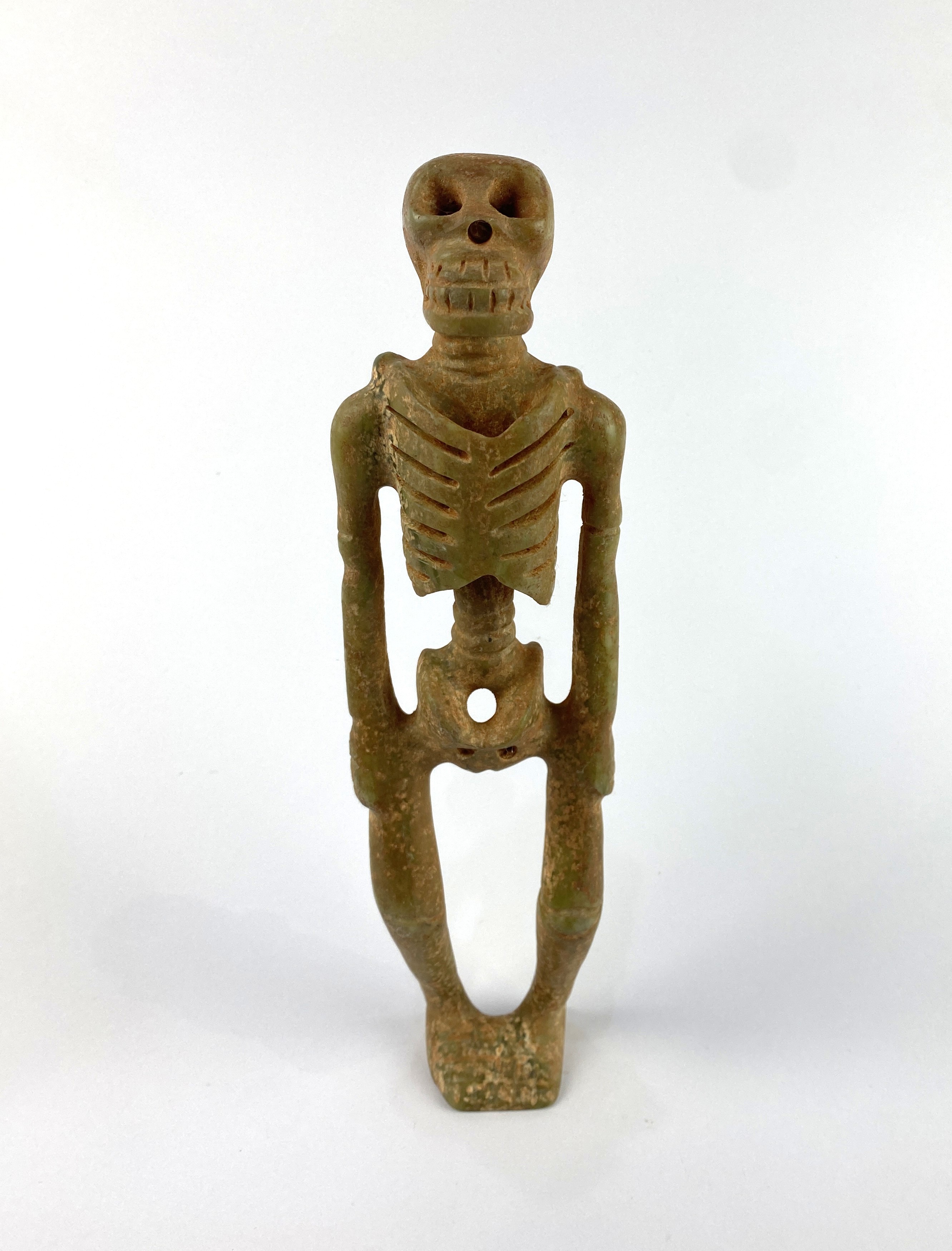 A Chinese carved stone, probably jade, figure of a human skeleton in the Neolithic style, believed to be Hongshan Culture, presents with signs of ageing, and patination, 30cm high.