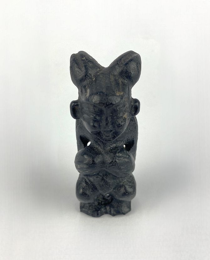 A Chinese carved figure, probably 'black maget' meteorite, believed to be Neolithic Hongshan Culture, presents with signs of ageing, wear and patination, 8.5cm high.