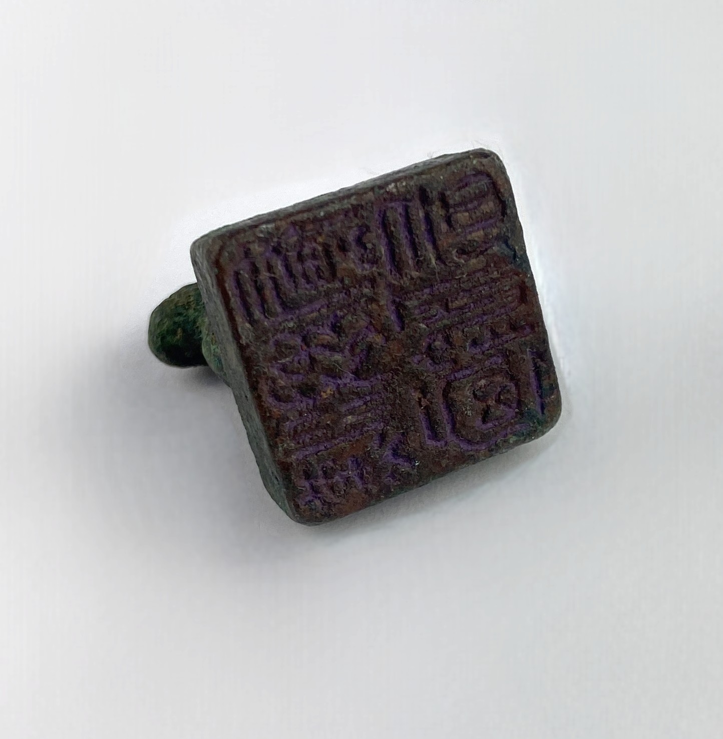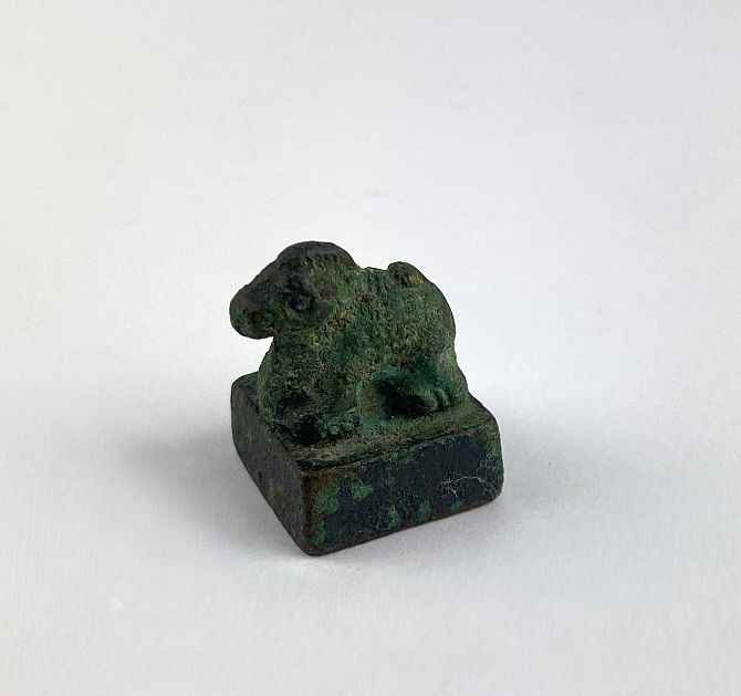 A Chinese bronze seal, cast with a standing creature on a plinth base, believed to be Ming Dynasty (1368 to 1644), 3cm high.