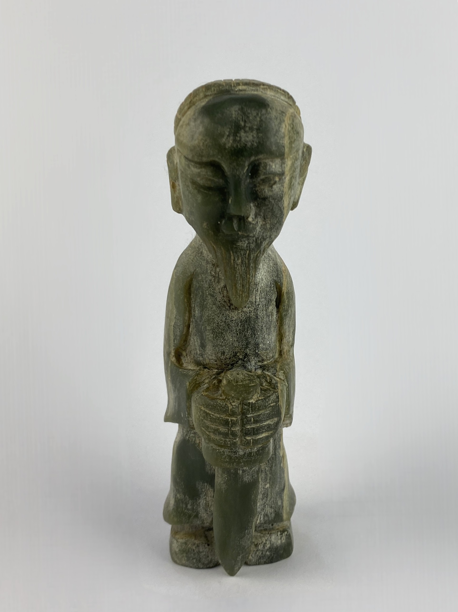 A Chinese carved jade figure depicting a Temple Guardian, believed to be c.1500BC, presents with signs of age and patination, 16cm high.