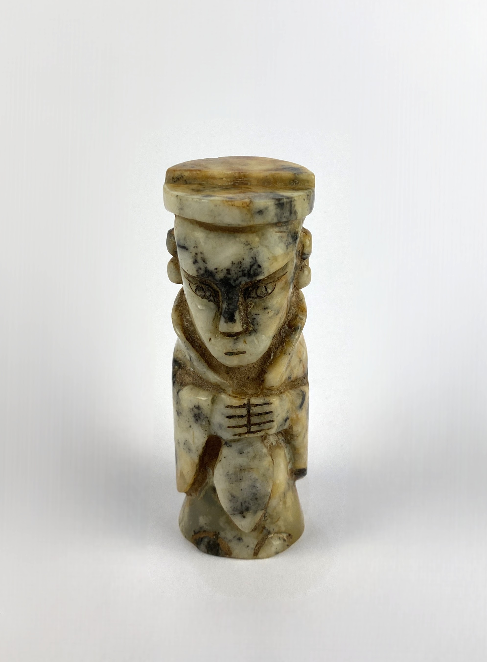 A Chinese carved jade figure depicting Guardian, believed to be c.100BC, presents with signs of ageing and patination, 11cm high.