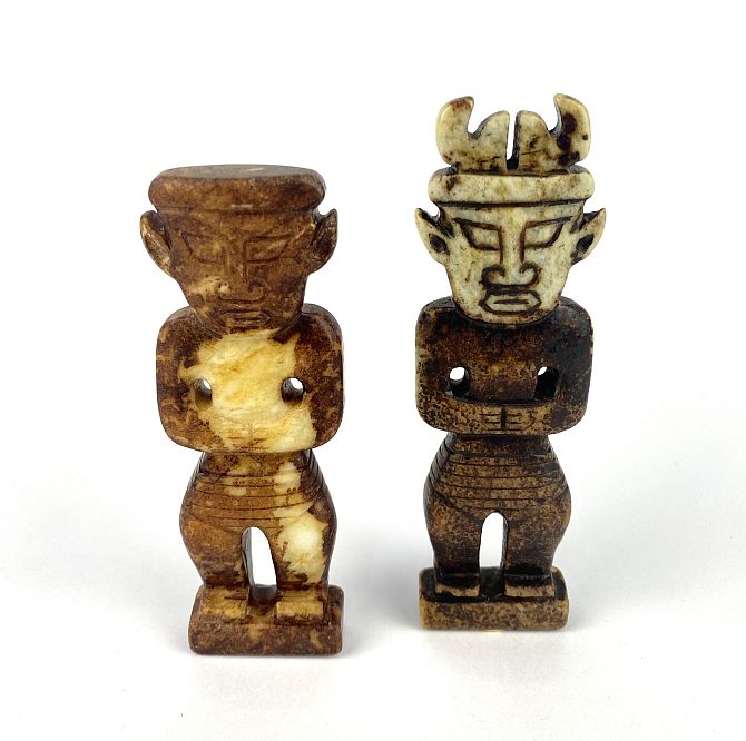 Two Chinese carved jade figures in an archaic style (but probably made within the last 100 years), 13cm and 11cm high, (2).