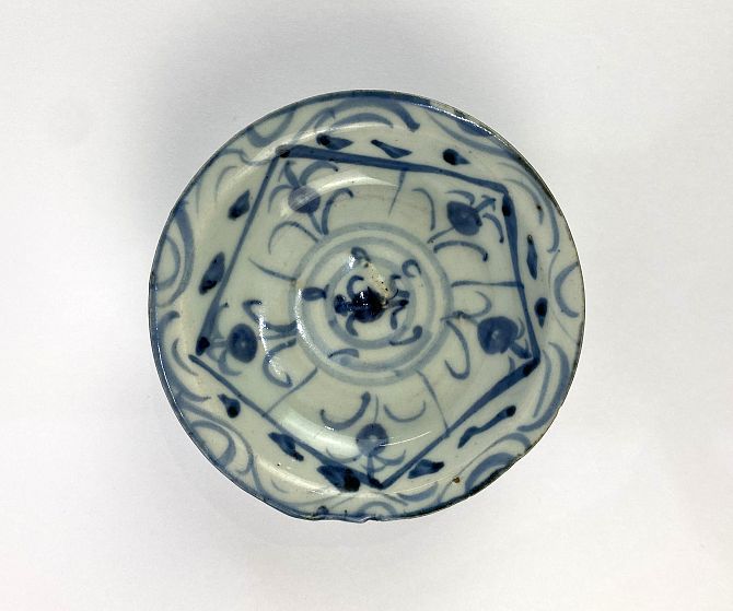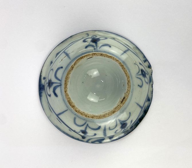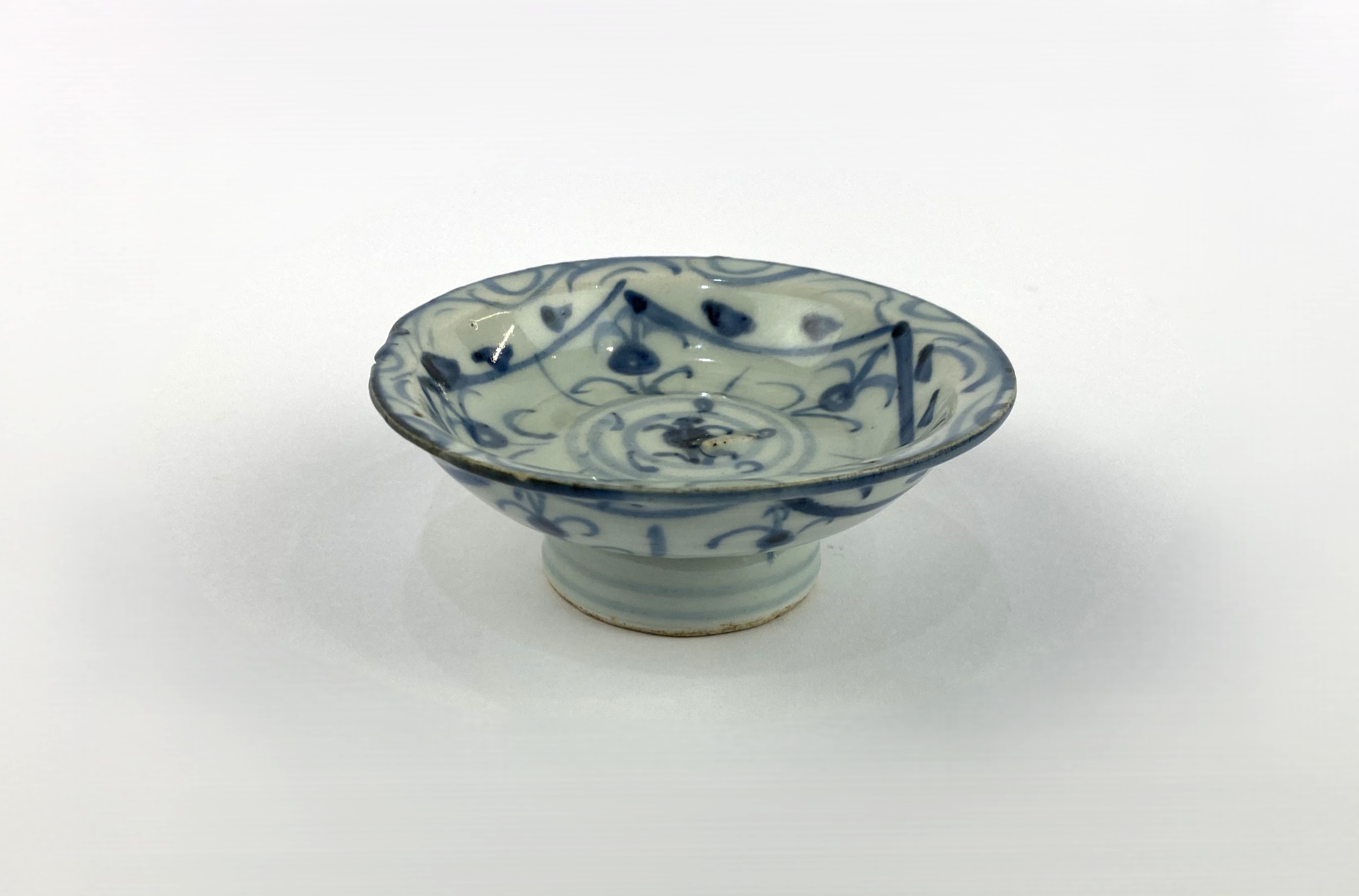 An antique asian blue and white ceramic footed bowl, probably Sawankhalok, Thailand, c.1690, naievely painted underglaze to the inside and outside areas, 11cm diameter by 4cm high.