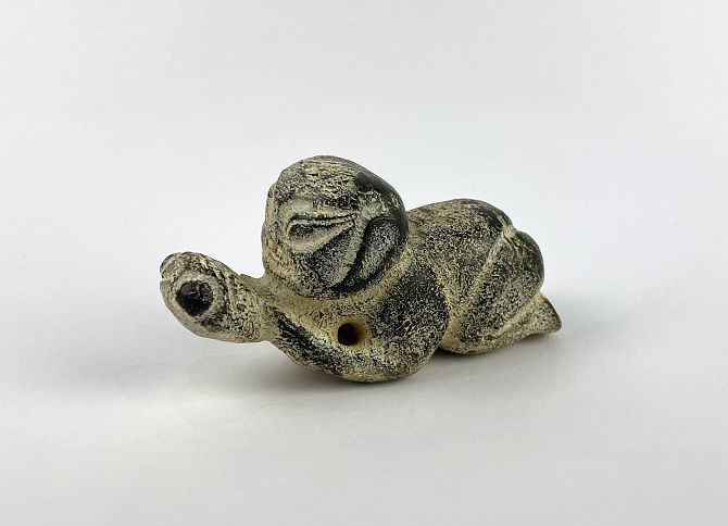 A Chinese carved jade model of a crawling figure, believed to be c.100AD, presents with signs of ageing, wear and patination, 15cm long by 8cm high.