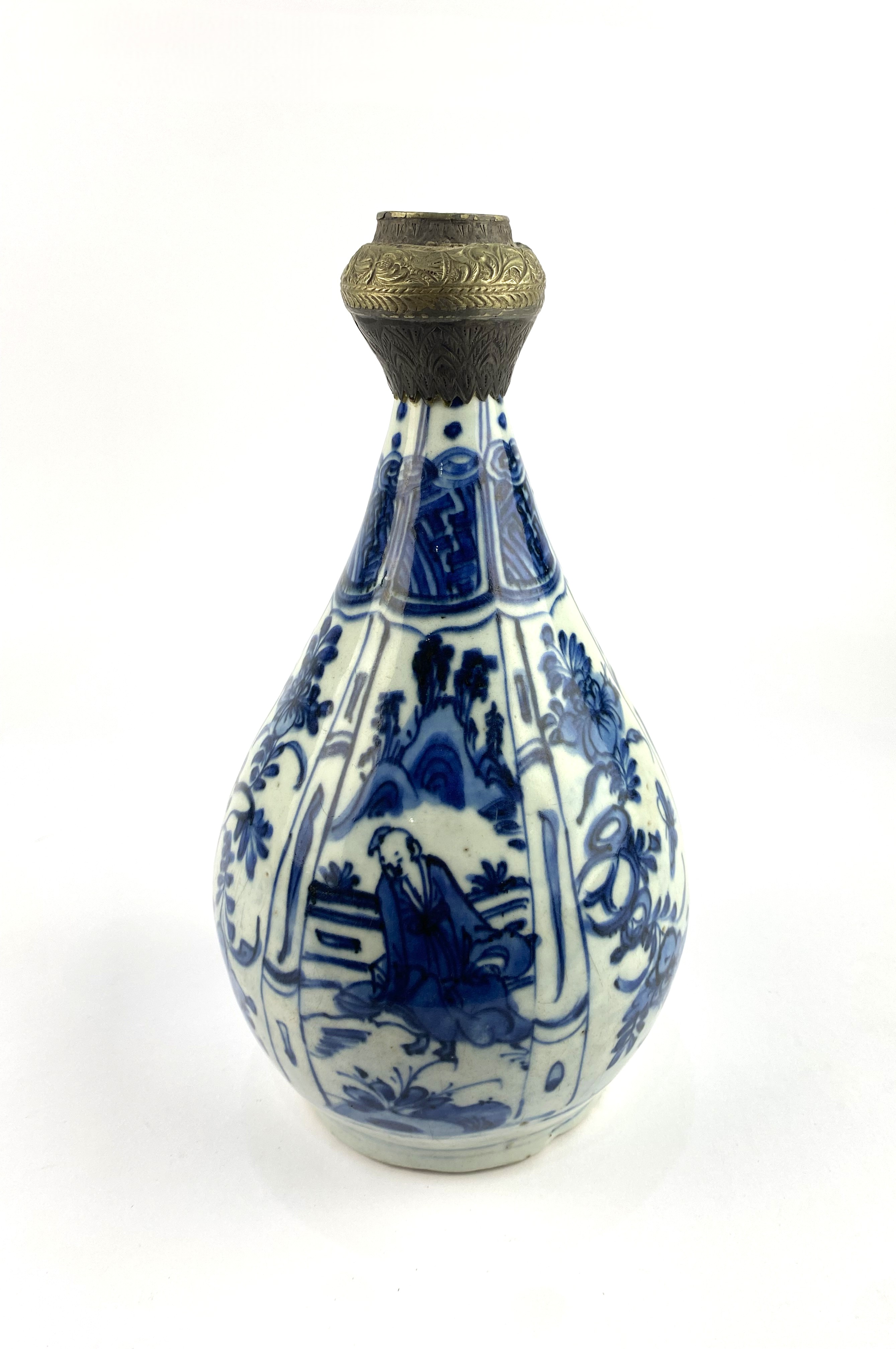 A Chinese blue and white porcelain bottle vase, decorated with figural and floral panels, Persian style metal mount, height 28.5cm