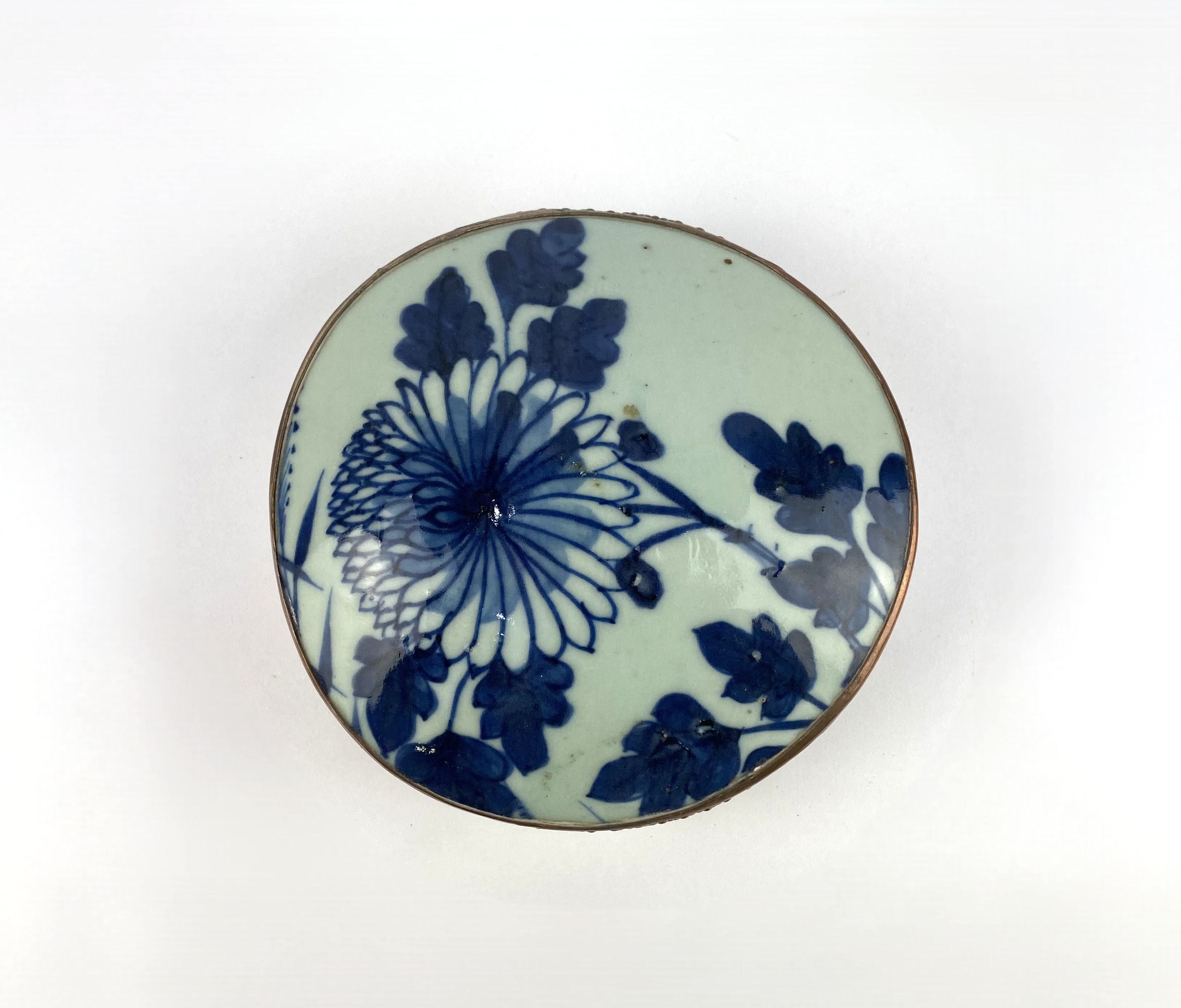 A Chinese blue and white porcelain lidded box, with pressed metal copper plated mount and base, diameter 13.5cm