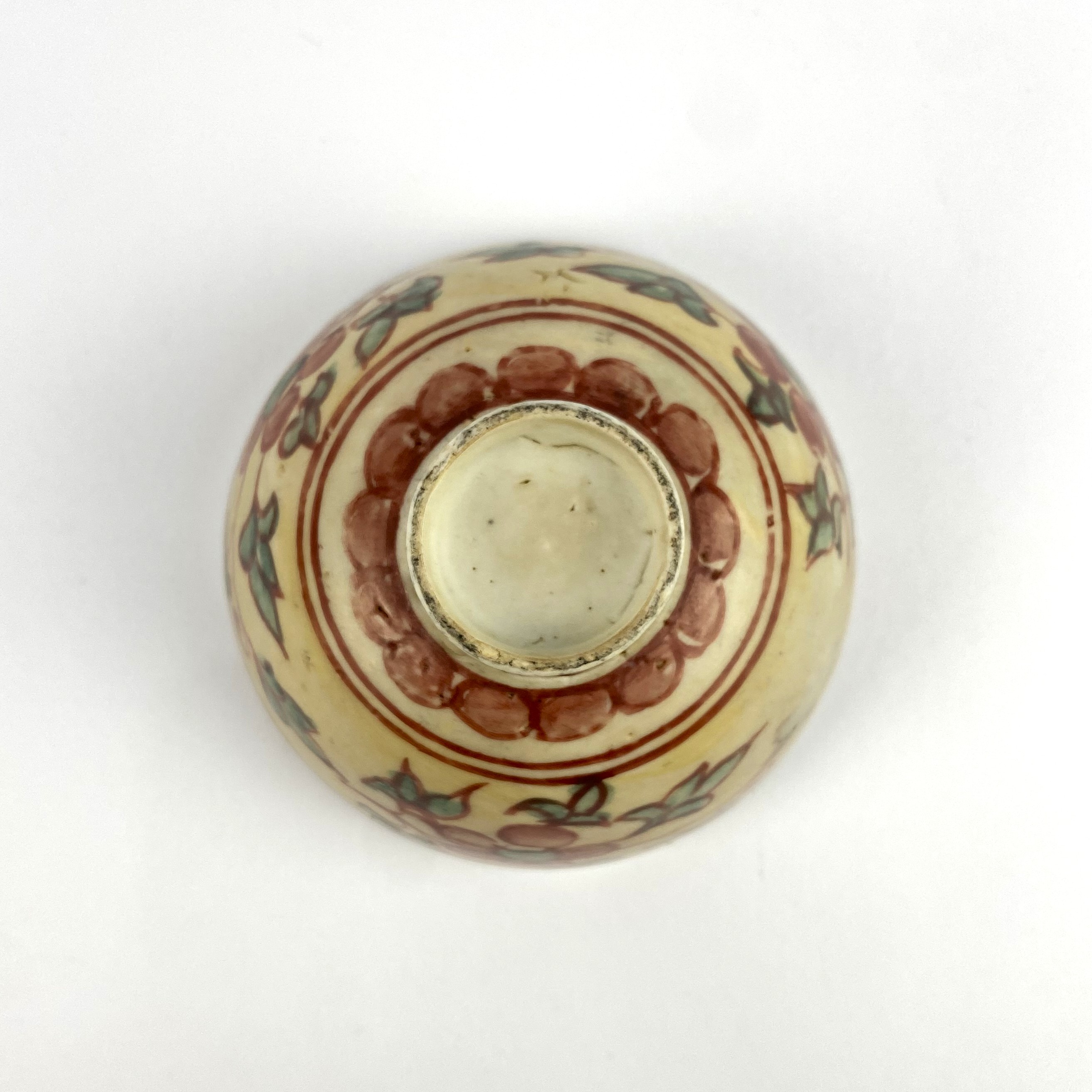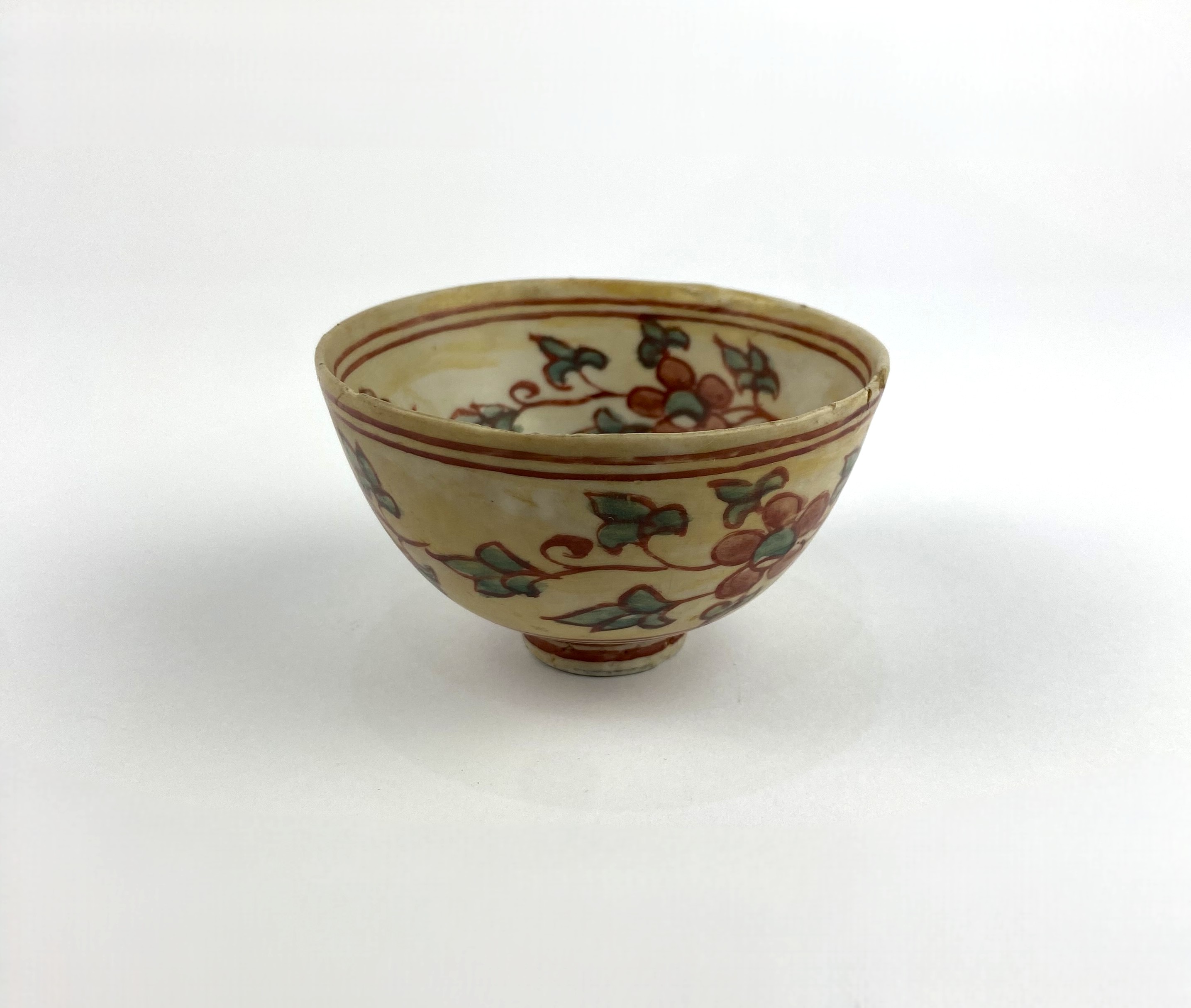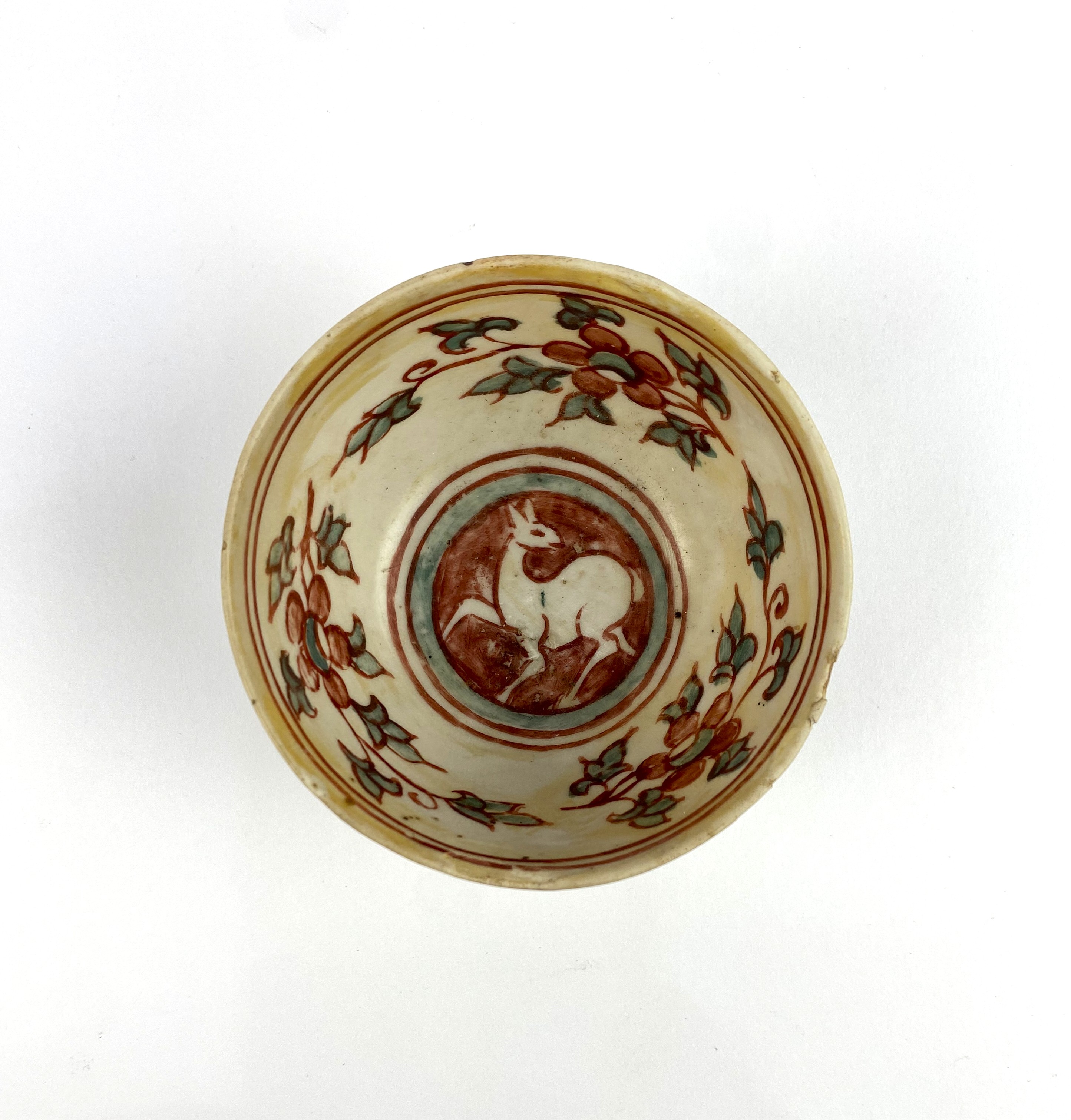 A Chinese Swatow ware type footed bowl/ tea bowl, polychrome decorated centrally with a deer, surrounded by a floral band to interior and exterior, diameter 9.5cm (AF)