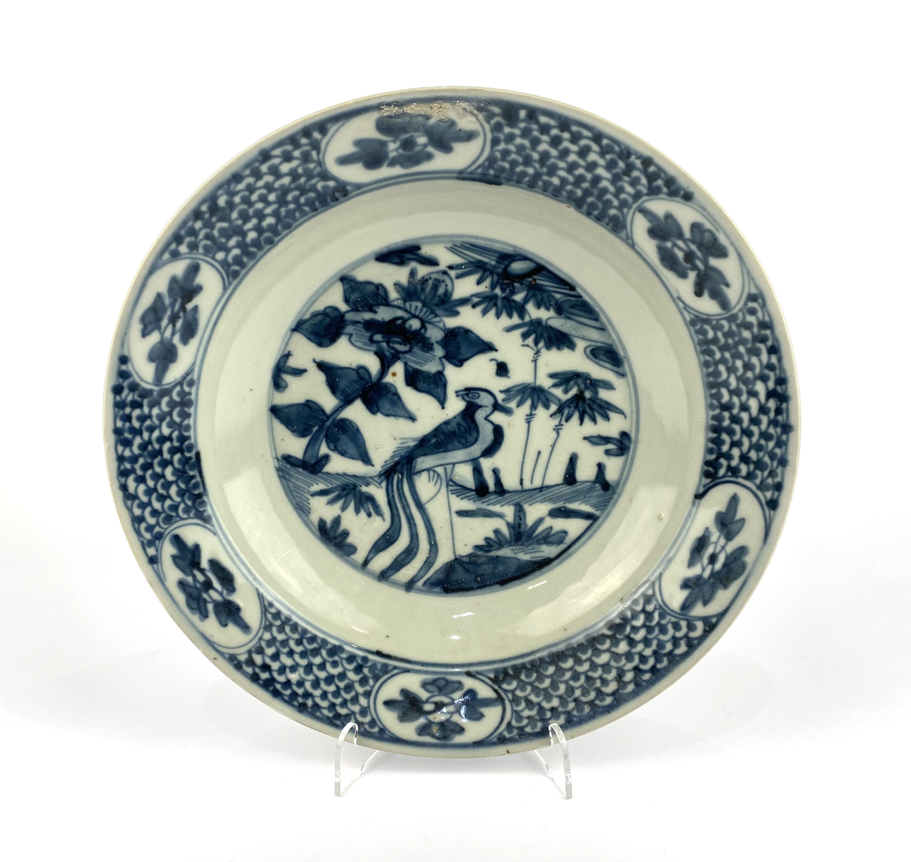 A Chinese blue and white Swatow ware bowl, decorated centrally with a bird/ pheonix within a landscape, fish scale pattern rim with floral panels, diameter 29cm (AF)