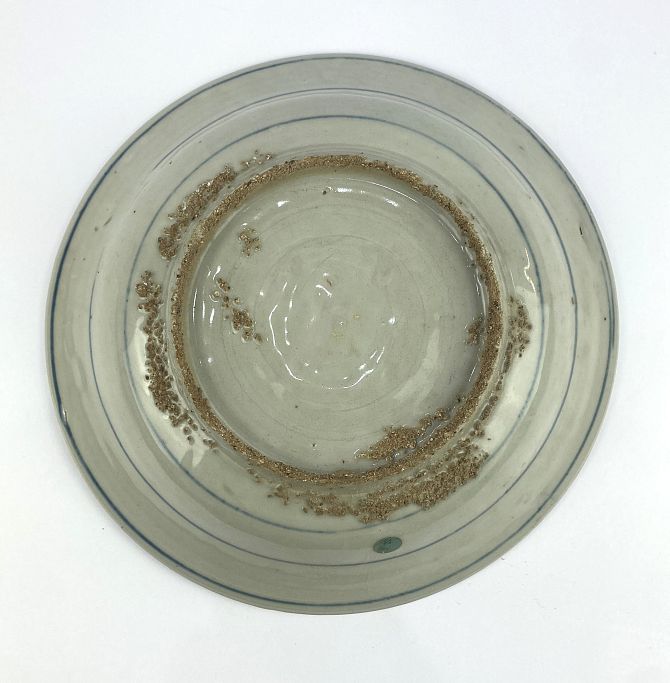 A Chinese blue and white porcelain charger decorated with figures in a landscape...