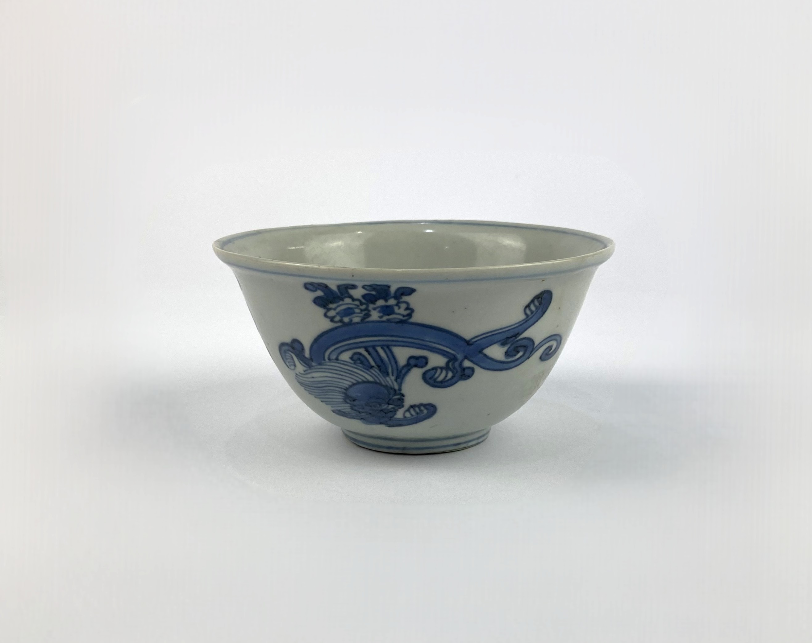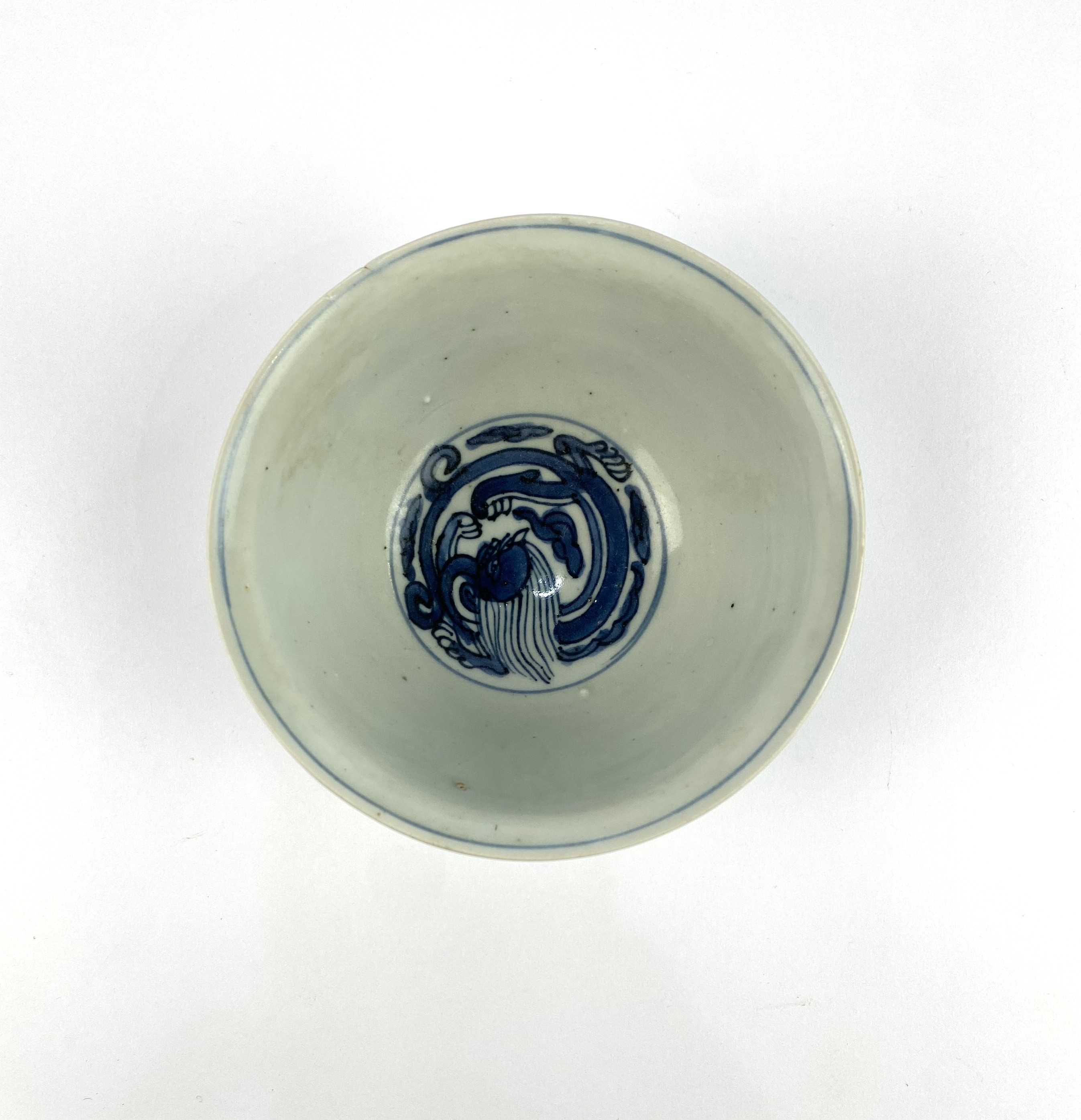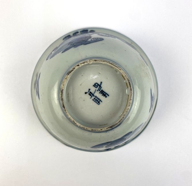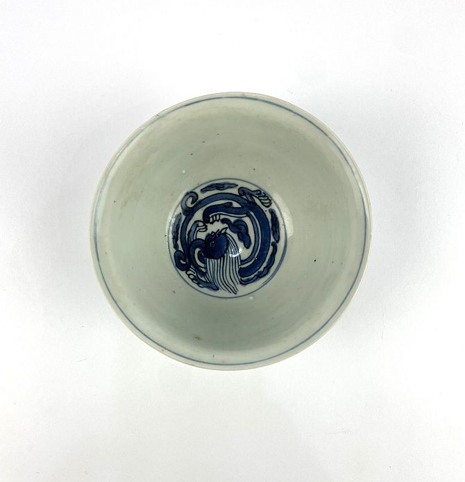 A Chinese blue and white porcelain bowl, decorated with dragaon and floral motif to exterior, interior with coiled dragon to centre, bearing underglazed blue four character mark to base, height 7cm