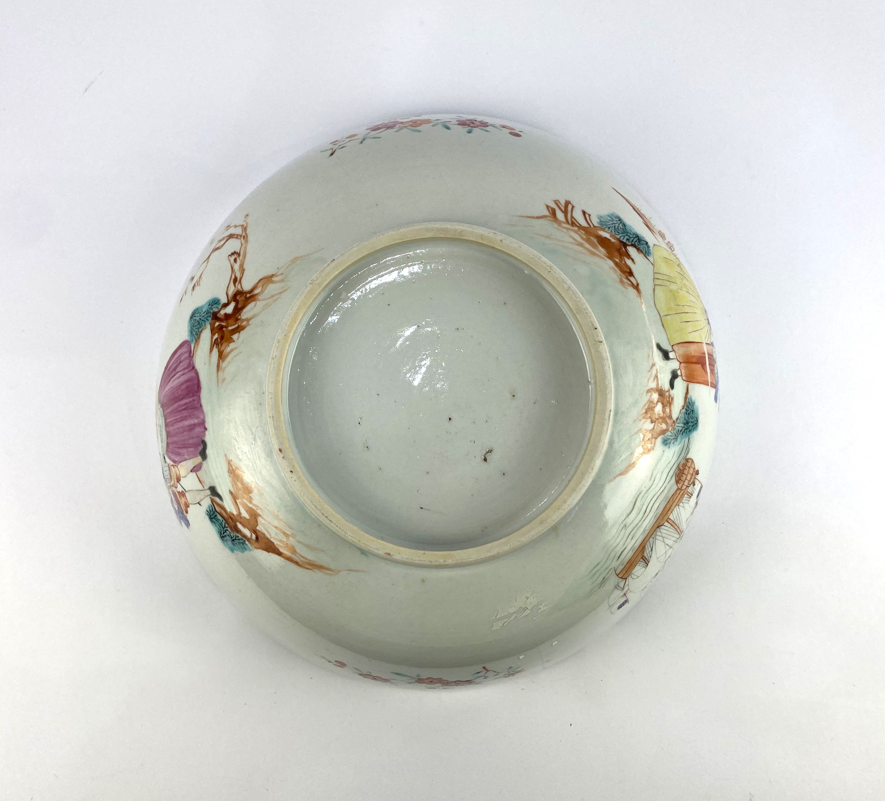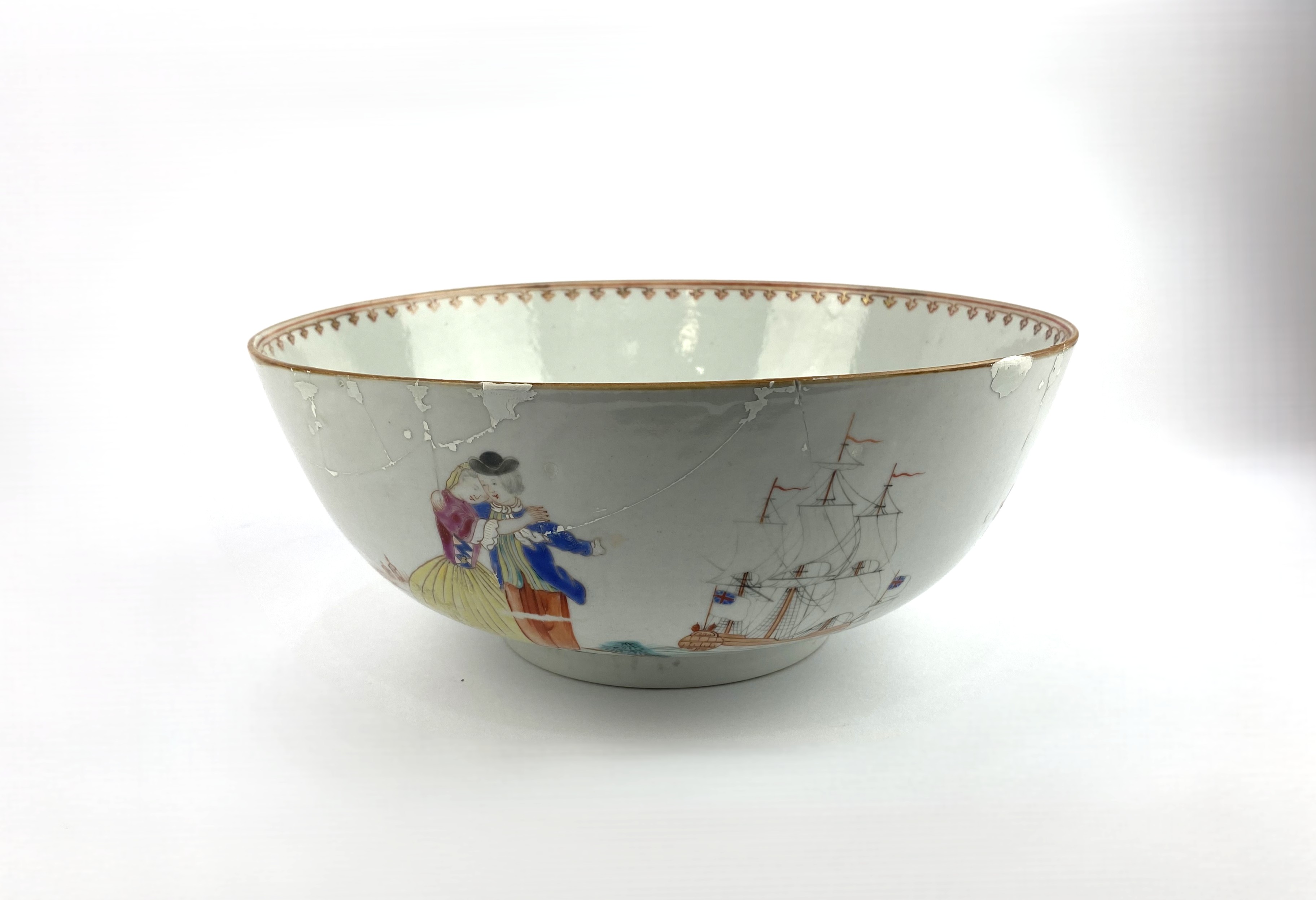 A Chinese export famille rose punch bowl, 18th century, decorated in polychrome enamels with scenes of a sailor's farewell before a British ship, and sailors return, with floral sprays, diameter 27.5cm (AF)