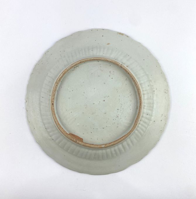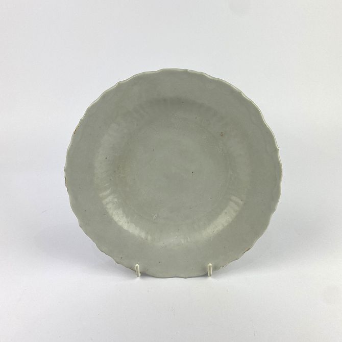 A Chinese glazed shaped dish, moulded with ribbed decoration to interior and exterior, shaped rim, cream coloured celadon type glaze, 20.5cm diameter (AF)