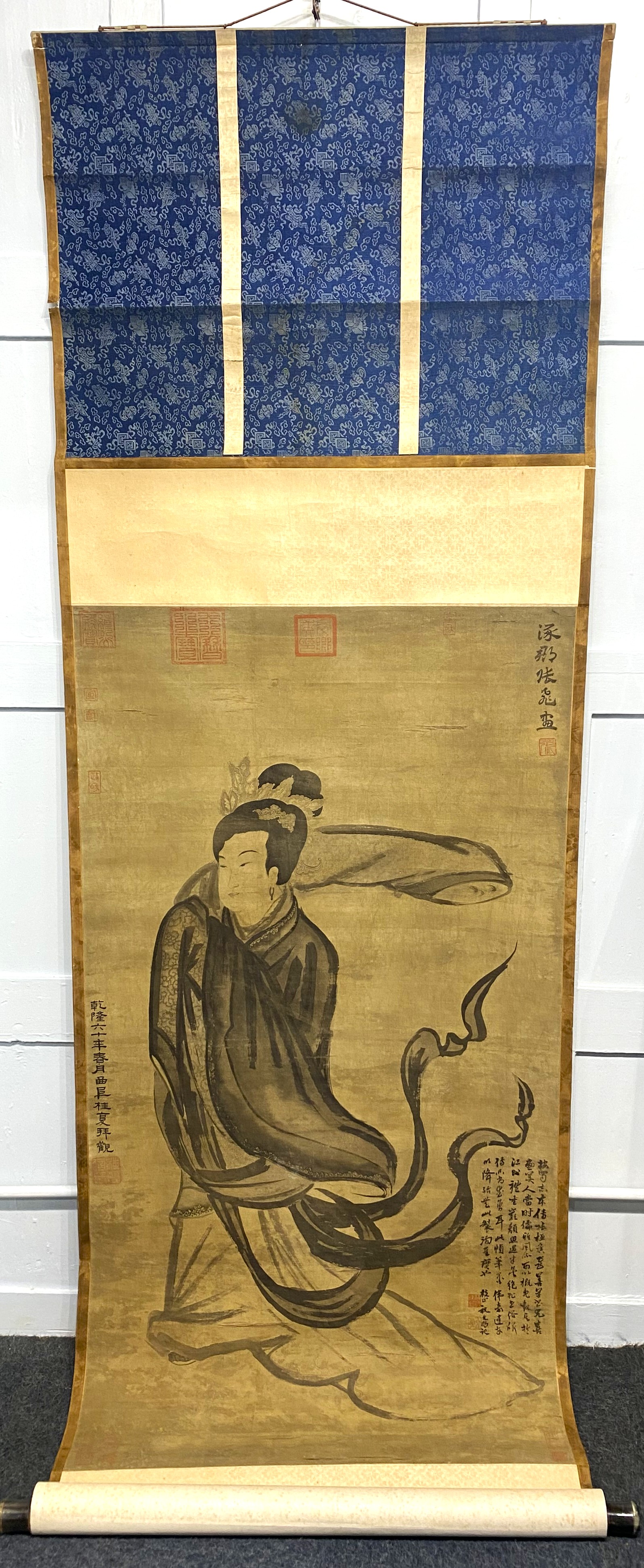 An 18th / 19th century Chinese hanging wall scroll of a figure, with Chinese calligraphy and red seal marks, central panel 140cm by 75cm (a/f)