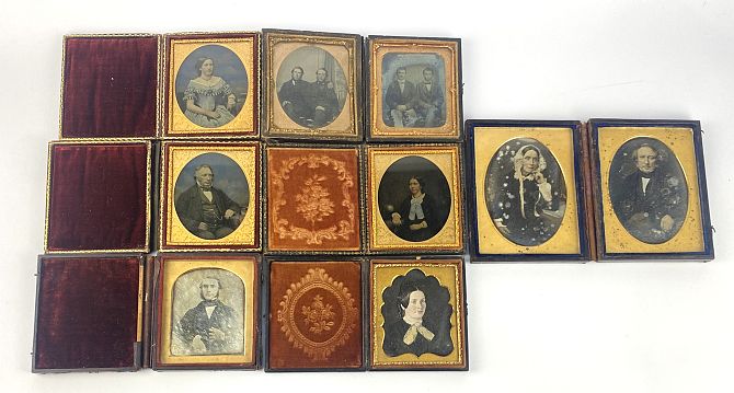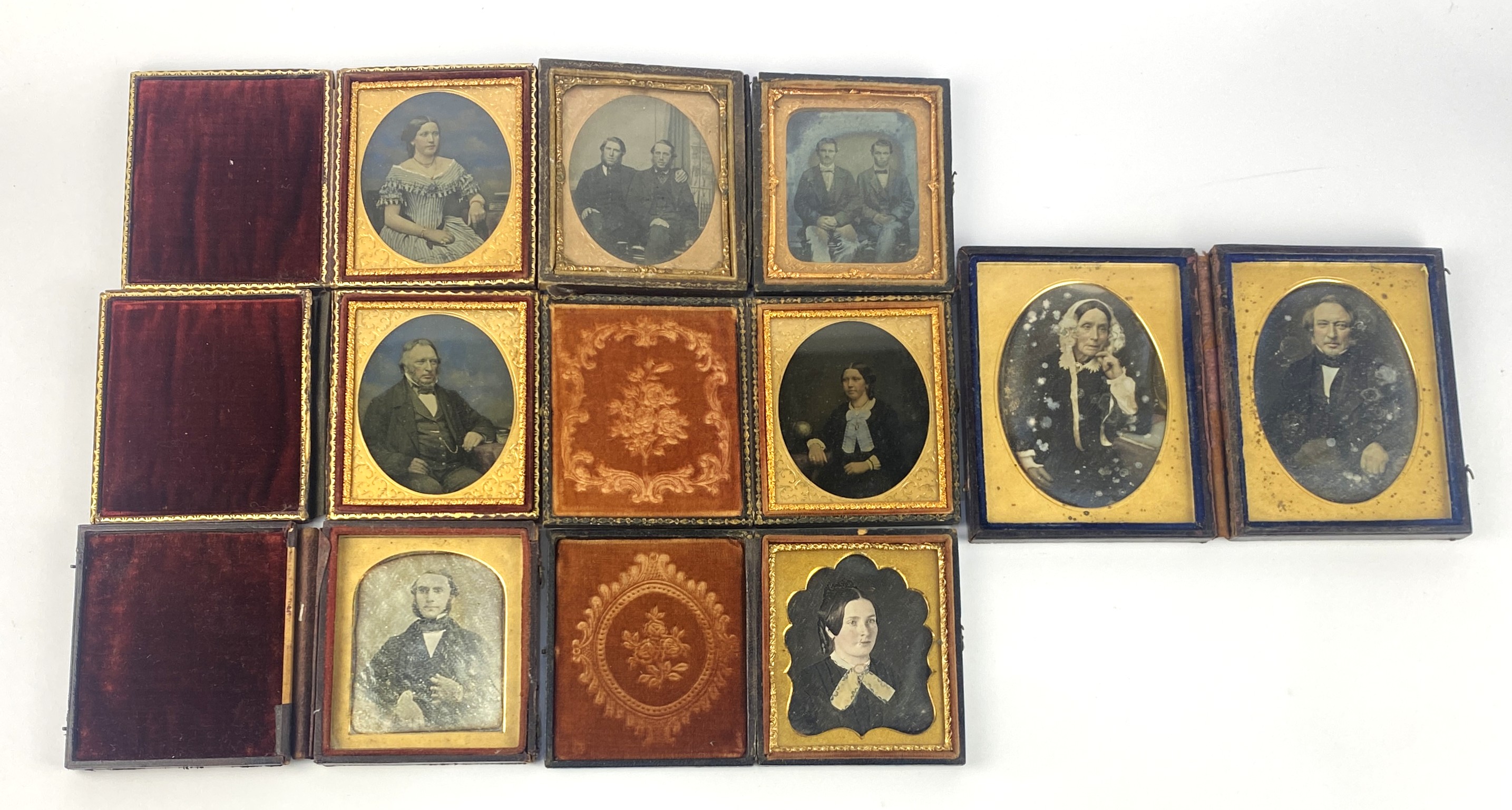 A collection of ambrotypes and daguerreotypes housed in leather and gilt cases, to include two portraits of male pairs, one pair depicted with one man’s arm placed around the other, with paper label verso for William Hobcraft Photographer 419, Oxford Street (a/f)