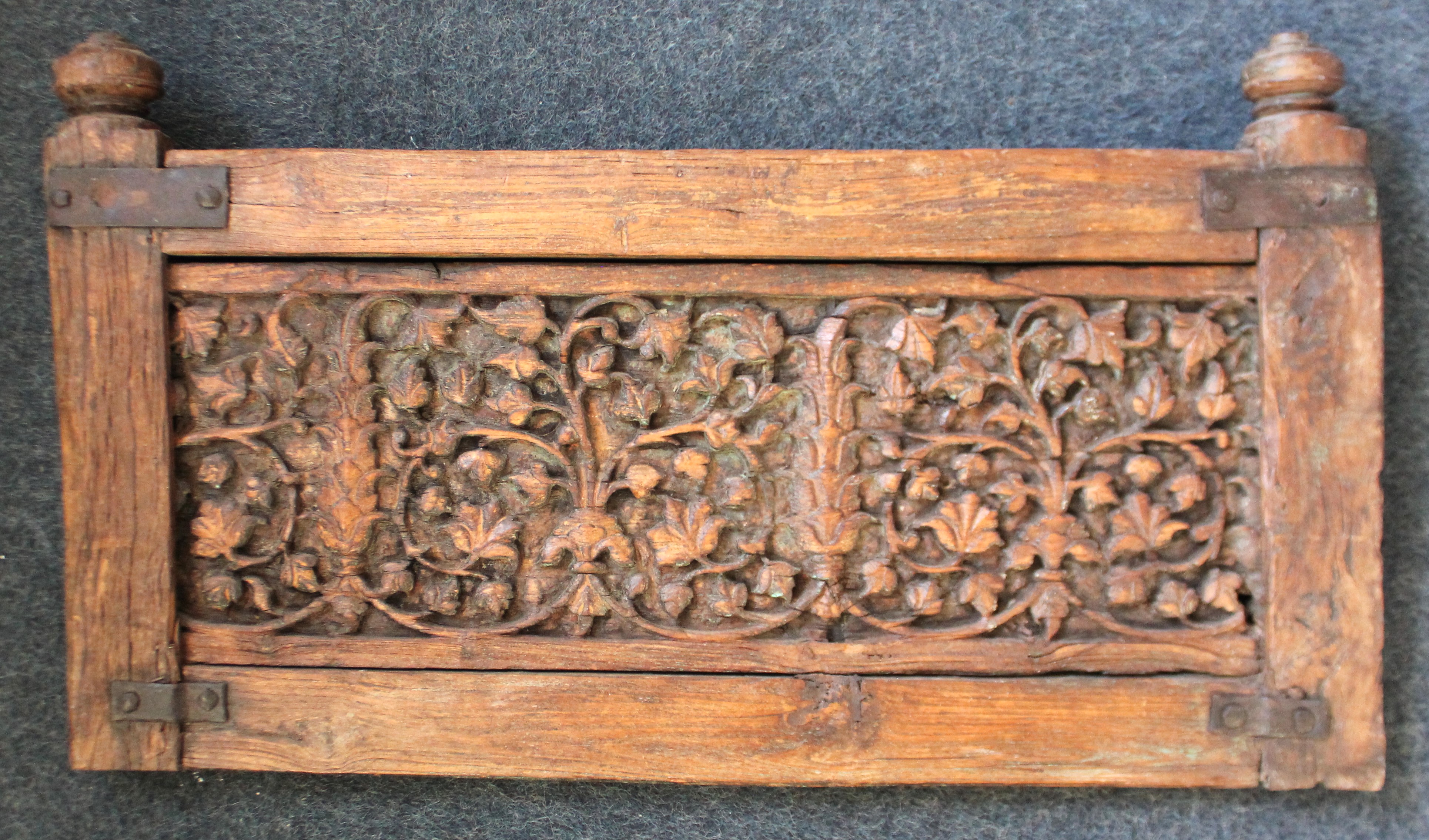 An antique carved wooden panel in a 17th century style, carved in high relief with meandering foliage, between solid plain borders with metal mounts, 90cm wide by 52cm high.