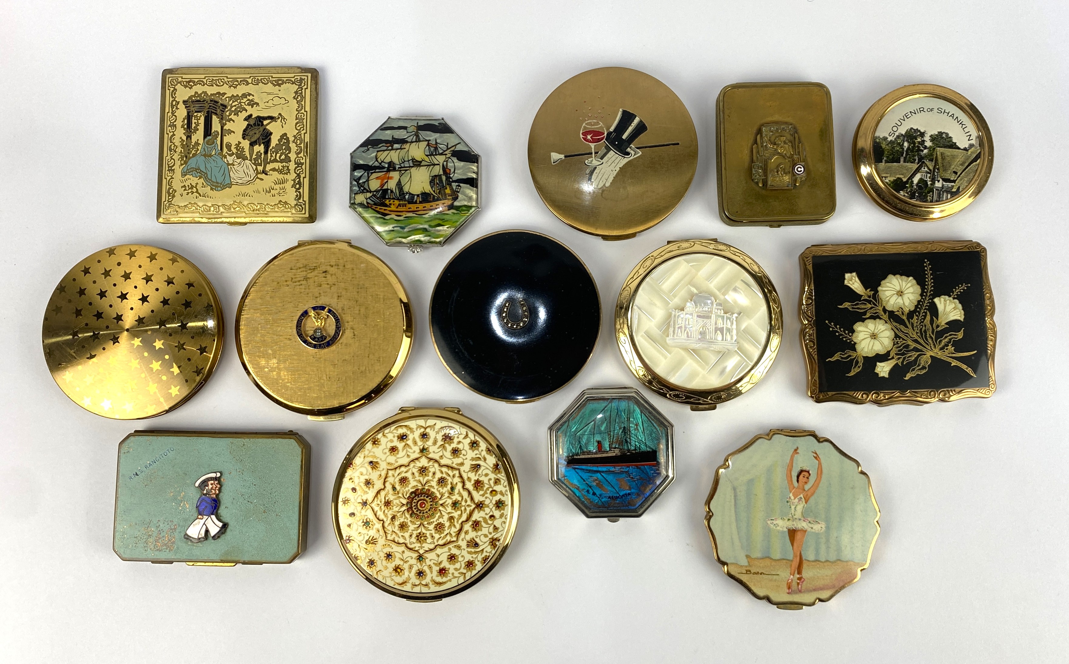 A collection of fourteen powder compacts, mostly Stratton, to include Stratton RMS Rangitoto decorated with two enamel sailors, Stratton Friends of the RAF Association, and an Art Deco brass compact